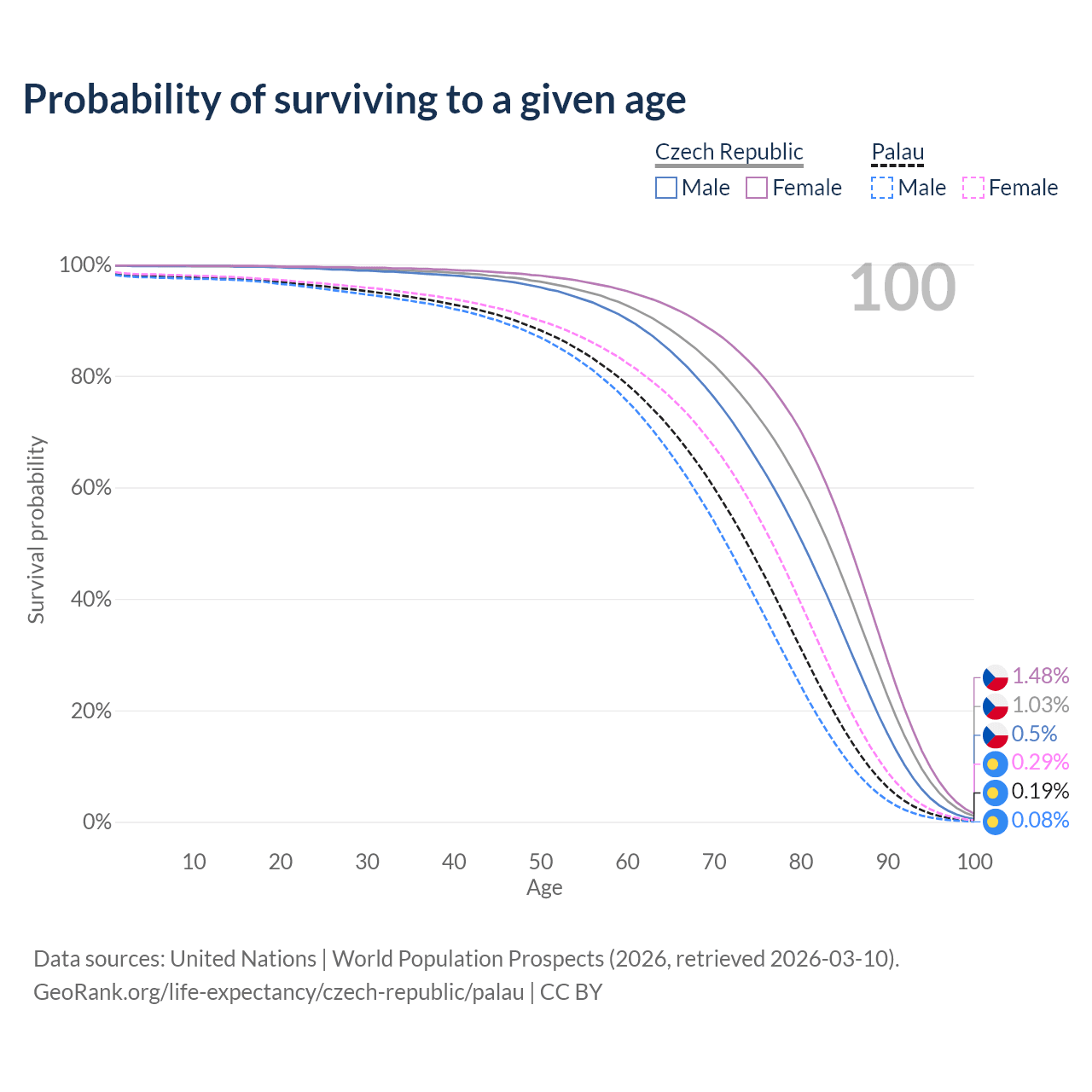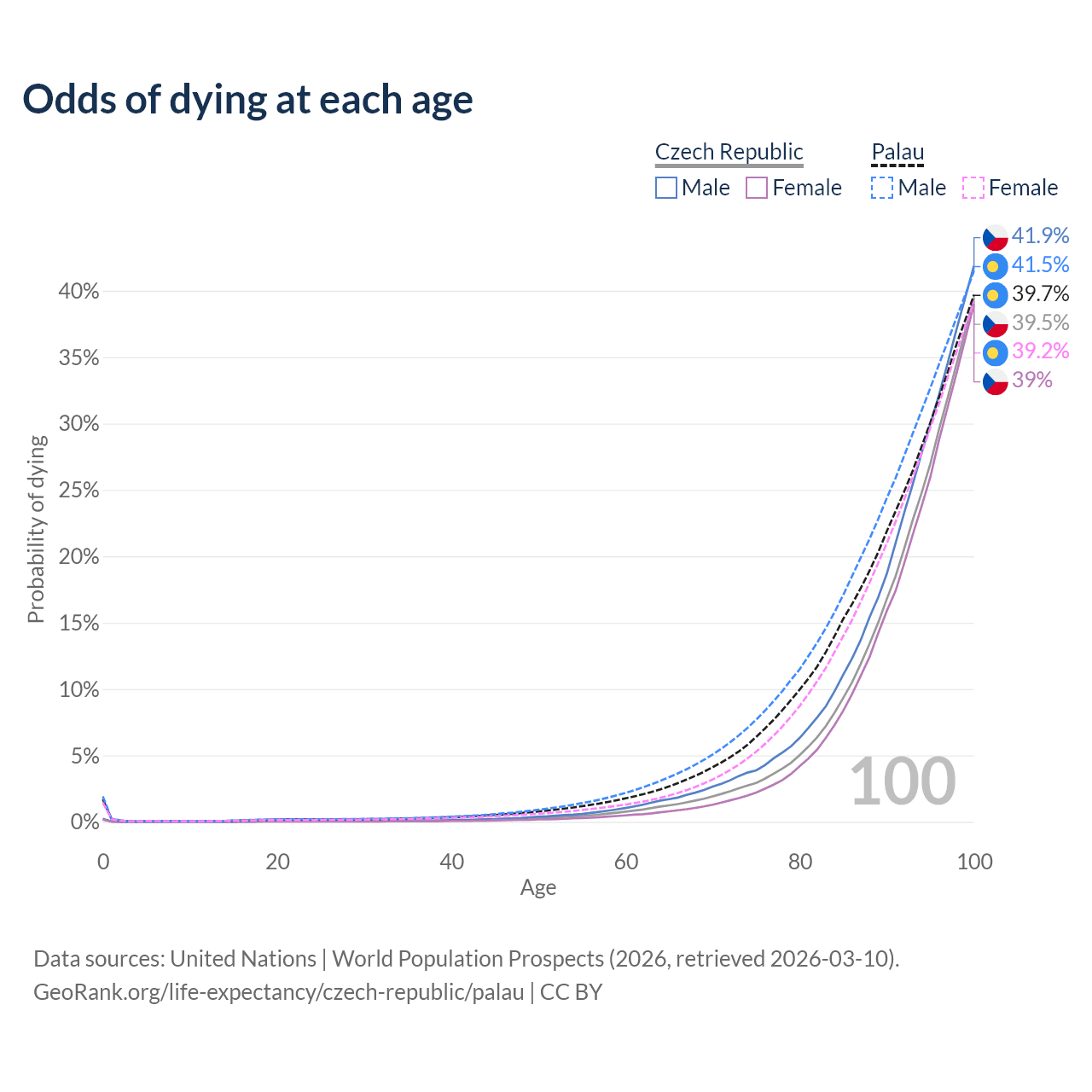 This life expectancy calculator shows the odds of living to 100, 95, 90, and below based on current age for both males and females in the Czech Republic and Palau, along with mean and median age of death. The calculations are based on the 2026 life tables (actuarial tables) from the UN World Population Prospects.