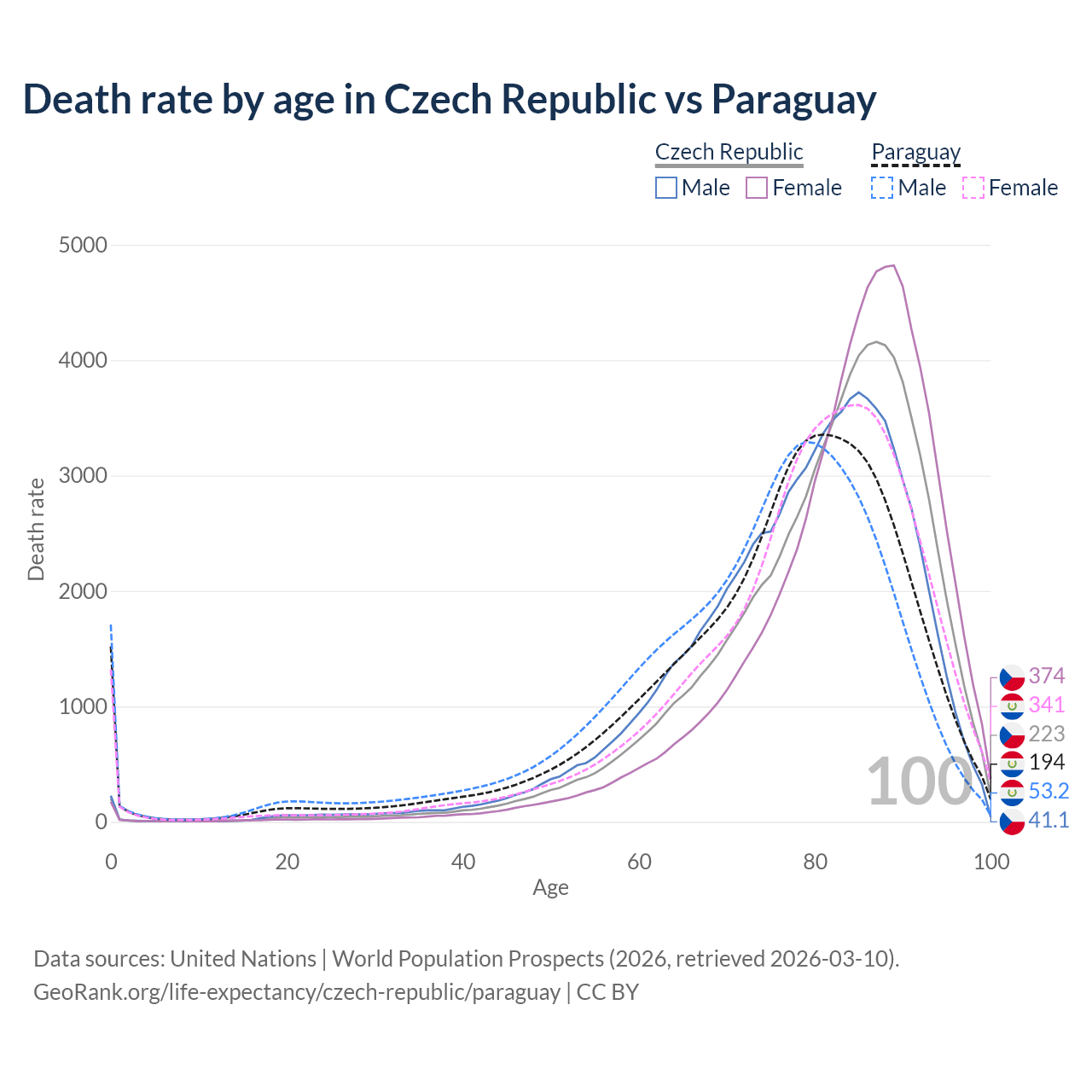 In the Czech Republic, the most common age of death is 87, compared to 81 in Paraguay. The median age of death is 83.2 in the Czech Republic and 78.4 in Paraguay, meaning only half of each cohort is expected to live past that age.