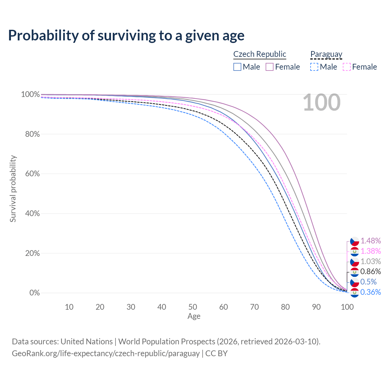 This life expectancy calculator shows the odds of living to 100, 95, 90, and below based on current age for both males and females in the Czech Republic and Paraguay, along with mean and median age of death. The calculations are based on the 2026 life tables (actuarial tables) from the UN World Population Prospects.