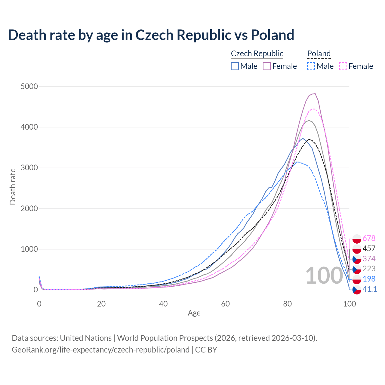 In the Czech Republic, the most common age of death is 87, compared to 87 in Poland. The median age of death is 83.2 in the Czech Republic and 82.5 in Poland, meaning only half of each cohort is expected to live past that age.