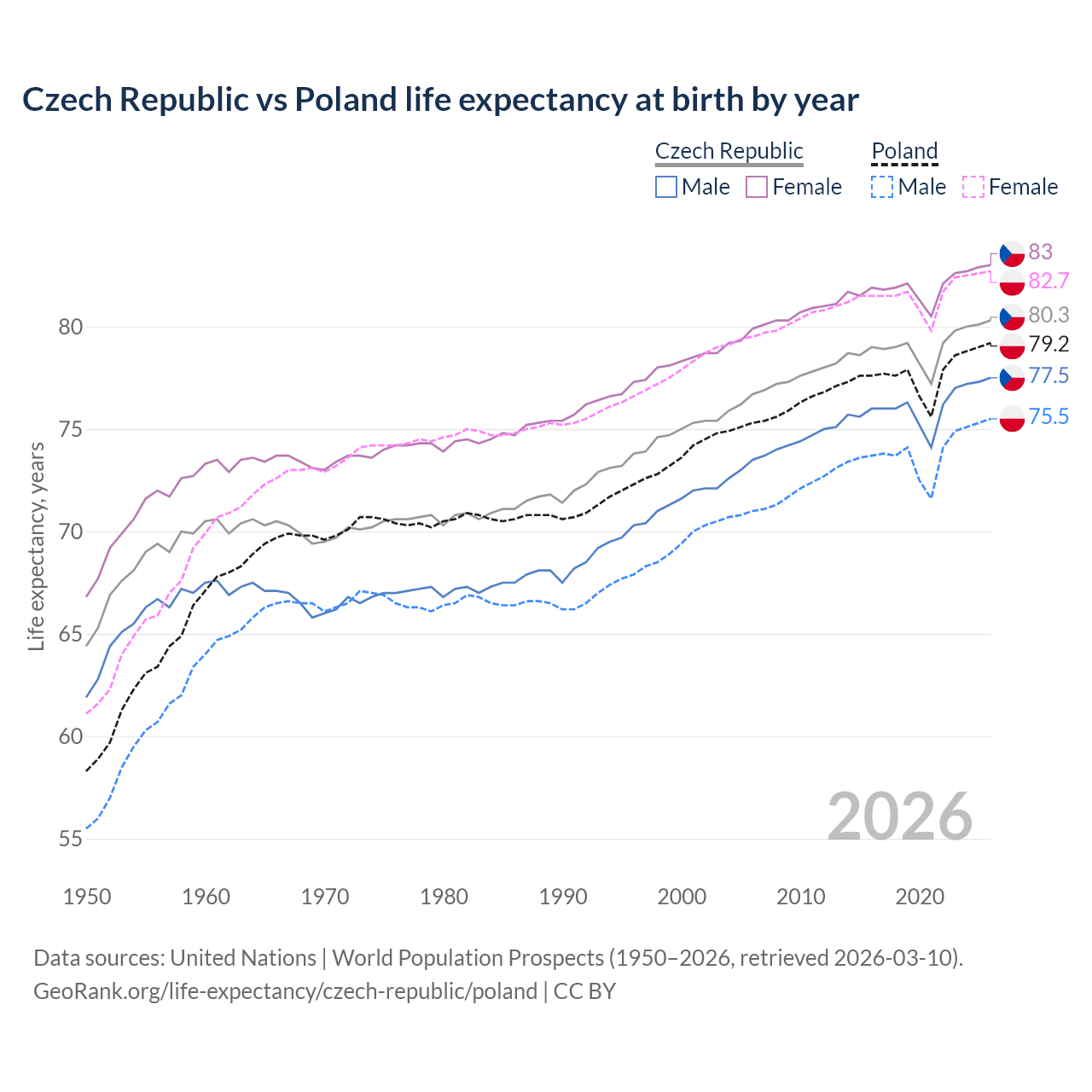 The average life expectancy at birth is 80.3 years in the Czech Republic vs 79.2 in Poland. The Czech Republic is ranked 44/197 by life expectancy, and Poland is 50/197. In the Czech Republic, the life expectancy is 77.5 years for males and 83 years for females. In Poland, it's 75.5 years for males and 82.7 years for females.