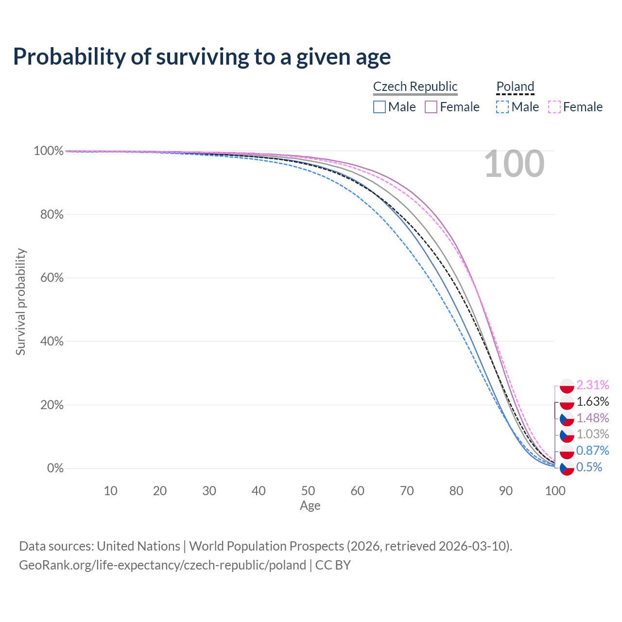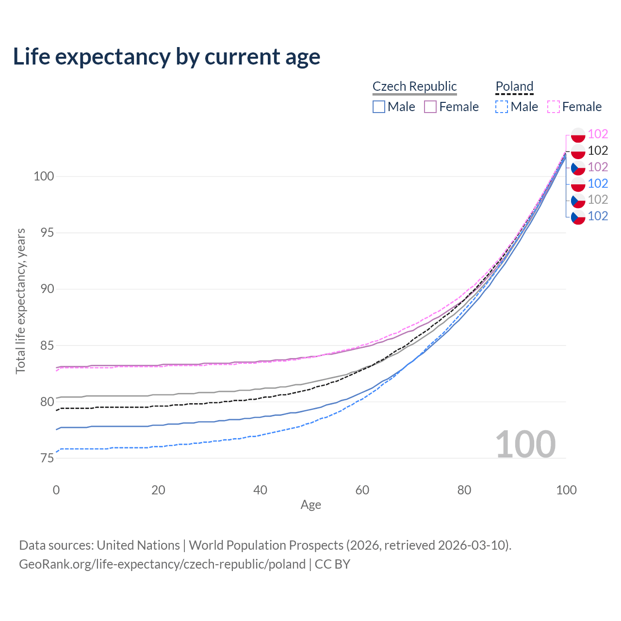 This life expectancy calculator shows the odds of living to 100, 95, 90, and below based on current age for both males and females in the Czech Republic and Poland, along with mean and median age of death. The calculations are based on the 2026 life tables (actuarial tables) from the UN World Population Prospects.