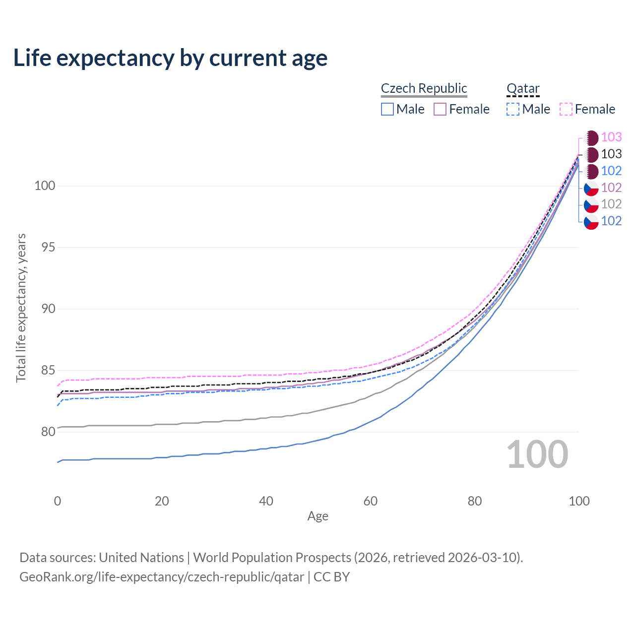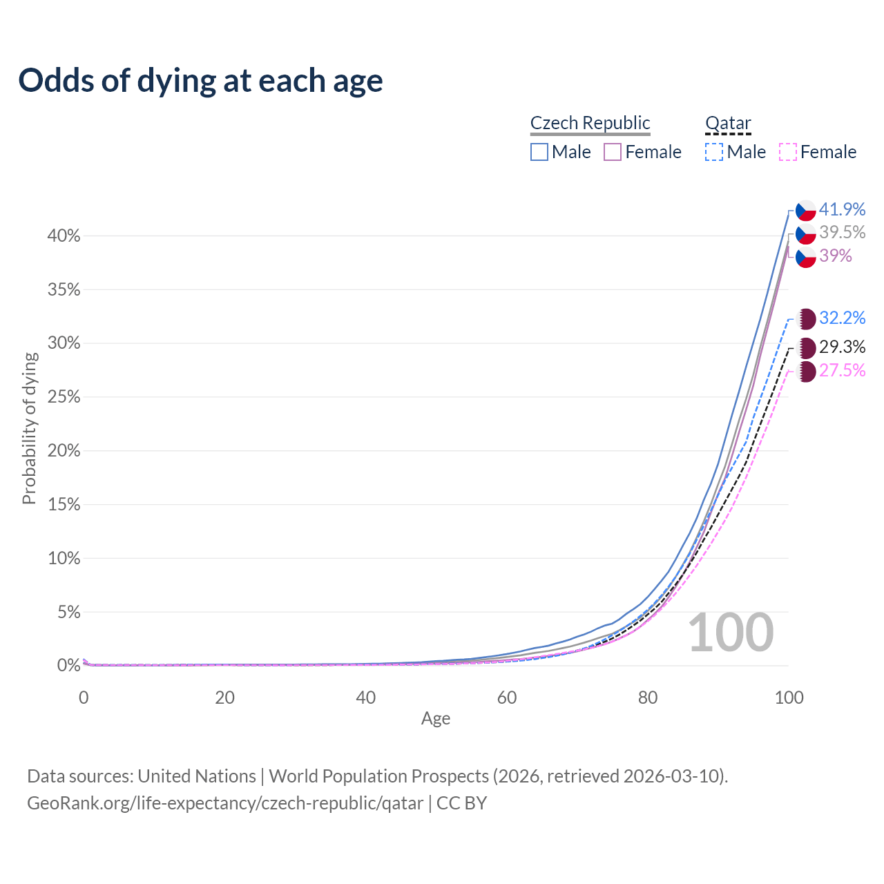 This life expectancy calculator shows the odds of living to 100, 95, 90, and below based on current age for both males and females in the Czech Republic and Qatar, along with mean and median age of death. The calculations are based on the 2026 life tables (actuarial tables) from the UN World Population Prospects.