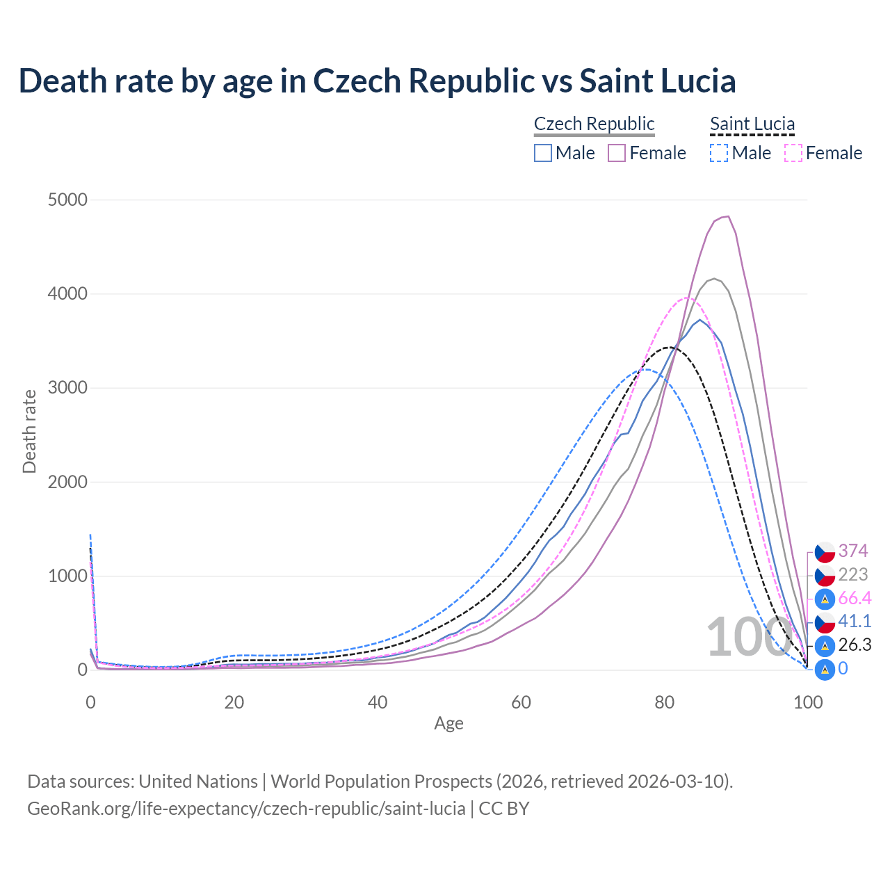 In the Czech Republic, the most common age of death is 87, compared to 81 in Saint Lucia. The median age of death is 83.2 in the Czech Republic and 76.8 in Saint Lucia, meaning only half of each cohort is expected to live past that age.