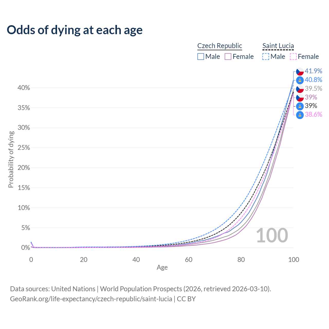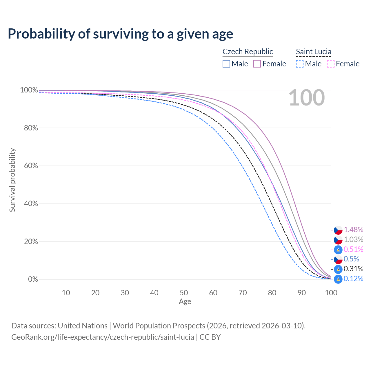 This life expectancy calculator shows the odds of living to 100, 95, 90, and below based on current age for both males and females in the Czech Republic and Saint Lucia, along with mean and median age of death. The calculations are based on the 2026 life tables (actuarial tables) from the UN World Population Prospects.
