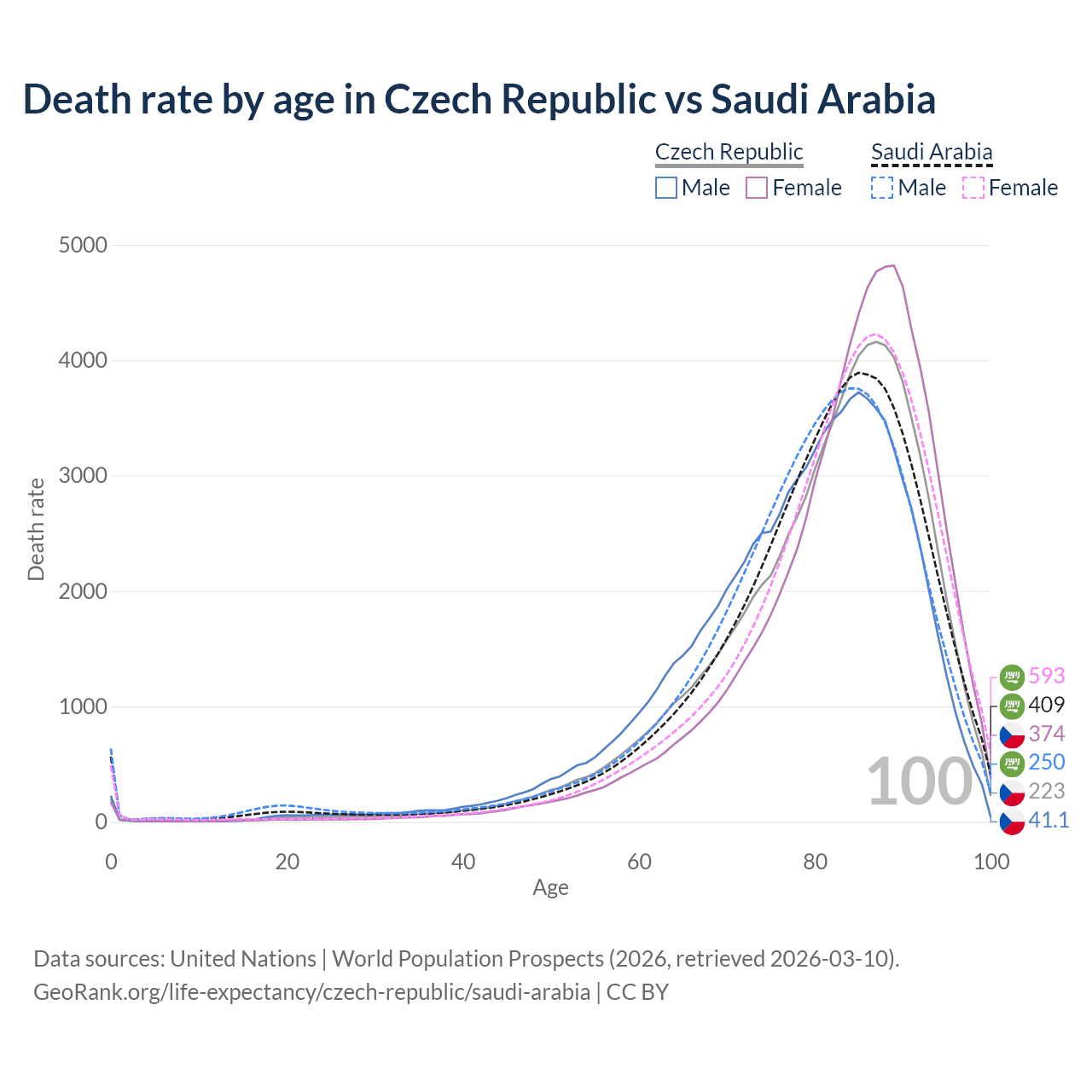 In the Czech Republic, the most common age of death is 87, compared to 85 in Saudi Arabia. The median age of death is 83.2 in the Czech Republic and 82.5 in Saudi Arabia, meaning only half of each cohort is expected to live past that age.