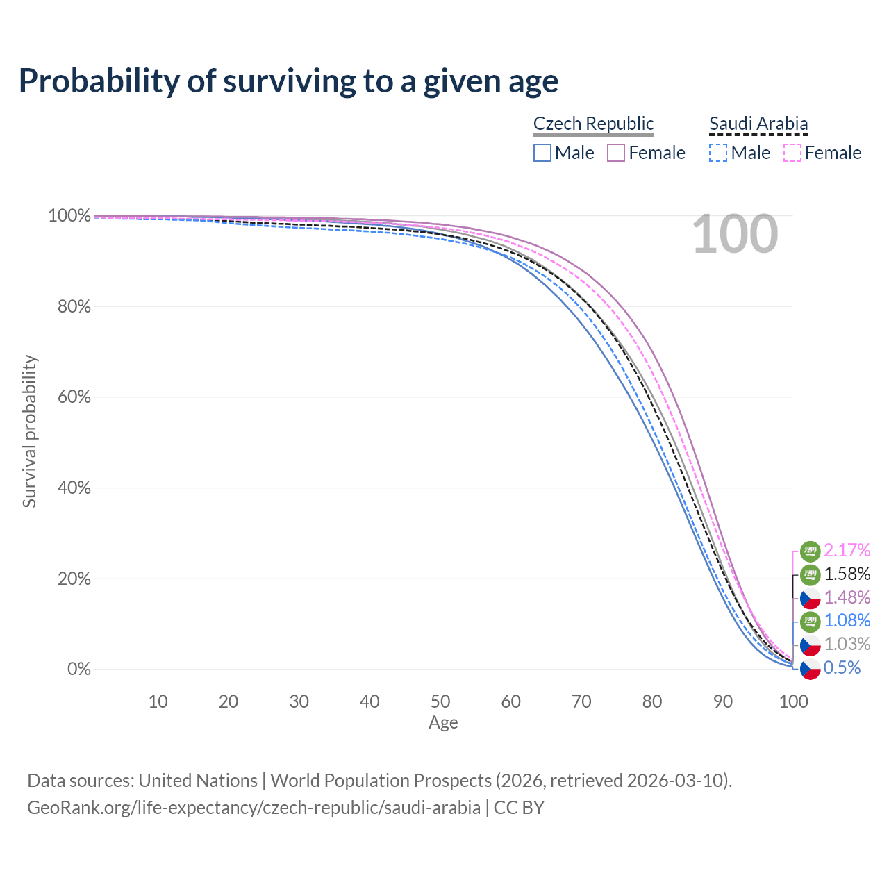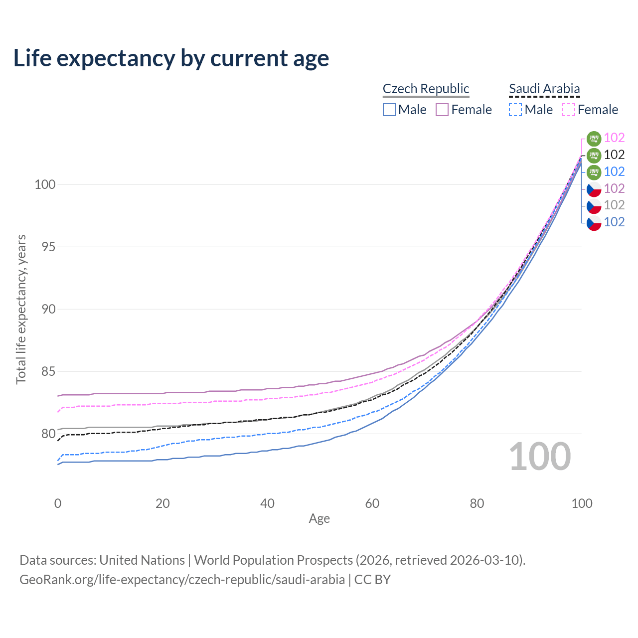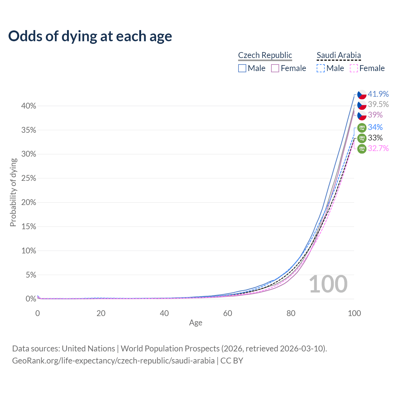 This life expectancy calculator shows the odds of living to 100, 95, 90, and below based on current age for both males and females in the Czech Republic and Saudi Arabia, along with mean and median age of death. The calculations are based on the 2026 life tables (actuarial tables) from the UN World Population Prospects.