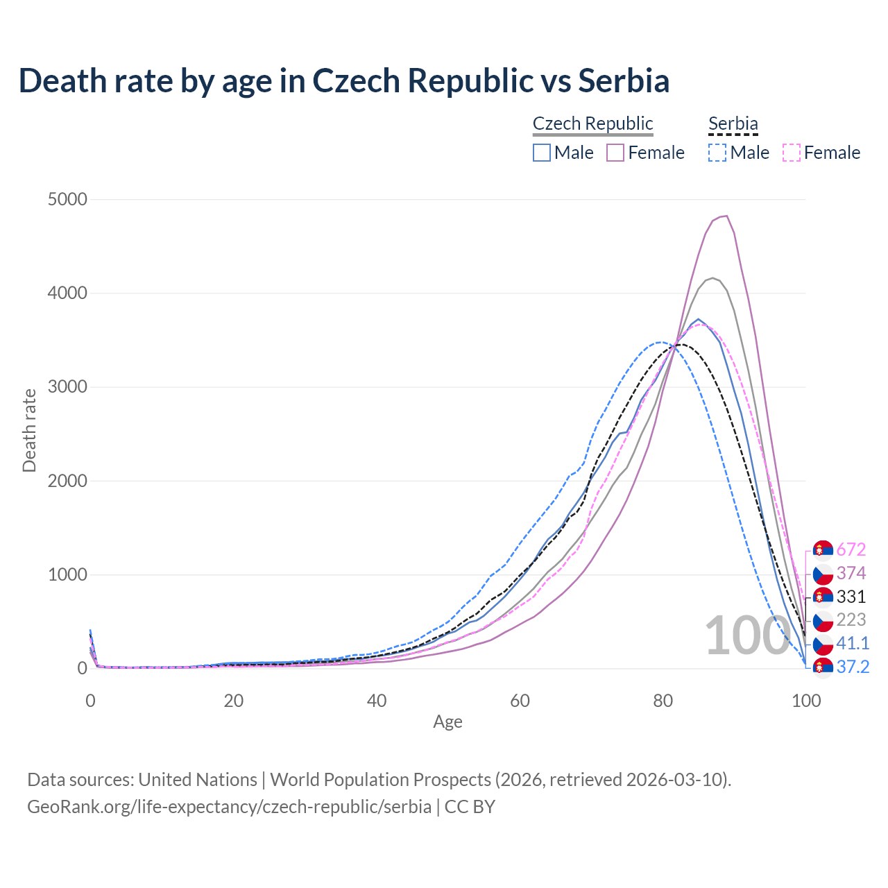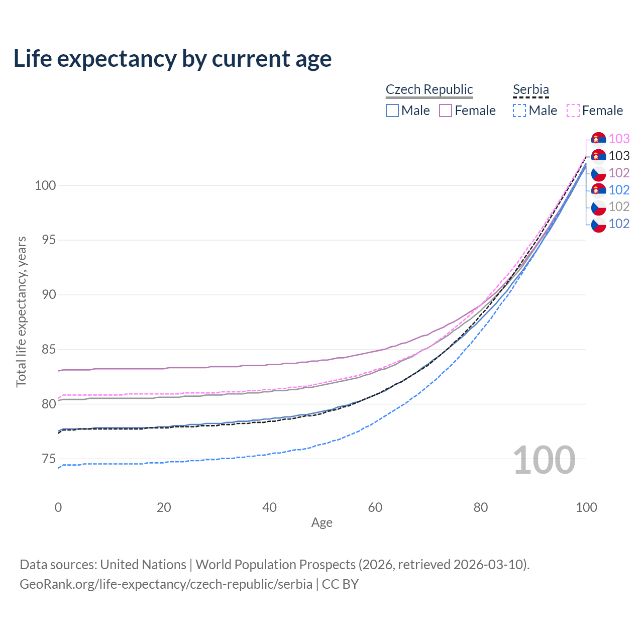 This life expectancy calculator shows the odds of living to 100, 95, 90, and below based on current age for both males and females in the Czech Republic and Serbia, along with mean and median age of death. The calculations are based on the 2026 life tables (actuarial tables) from the UN World Population Prospects.