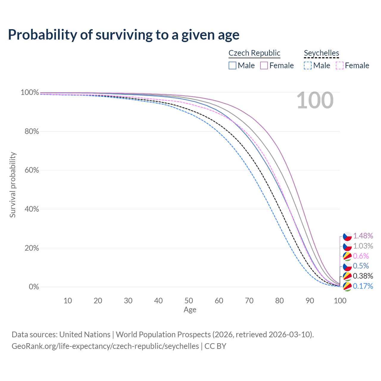 This life expectancy calculator shows the odds of living to 100, 95, 90, and below based on current age for both males and females in the Czech Republic and the Seychelles, along with mean and median age of death. The calculations are based on the 2026 life tables (actuarial tables) from the UN World Population Prospects.