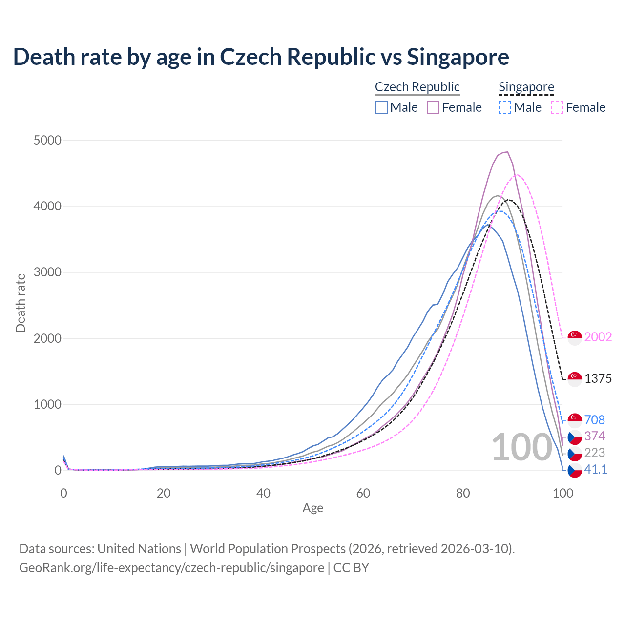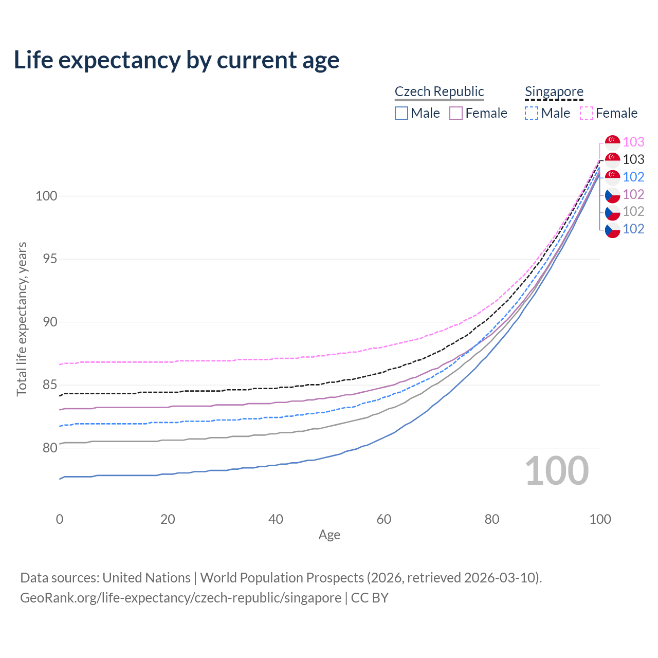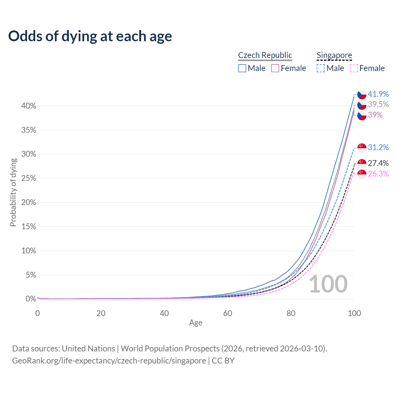 This life expectancy calculator shows the odds of living to 100, 95, 90, and below based on current age for both males and females in the Czech Republic and Singapore, along with mean and median age of death. The calculations are based on the 2026 life tables (actuarial tables) from the UN World Population Prospects.