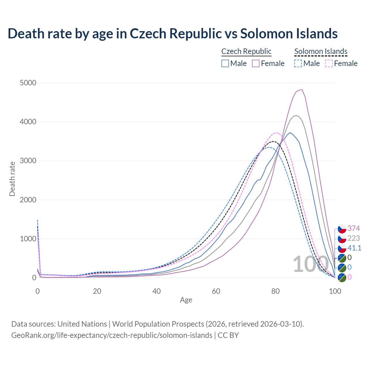 In the Czech Republic, the most common age of death is 87, compared to 79 in the Solomon Islands. The median age of death is 83.2 in the Czech Republic and 74.9 in the Solomon Islands, meaning only half of each cohort is expected to live past that age.