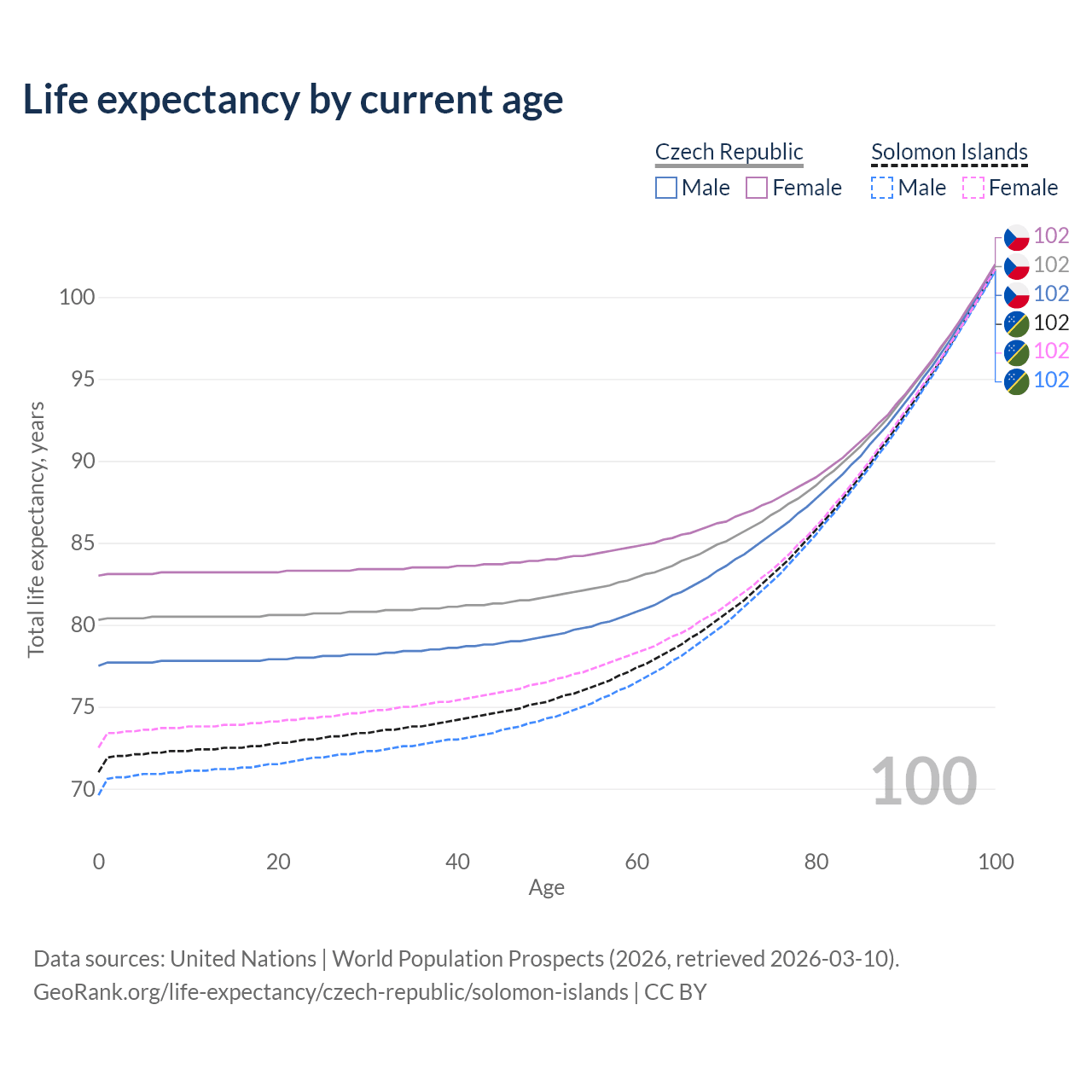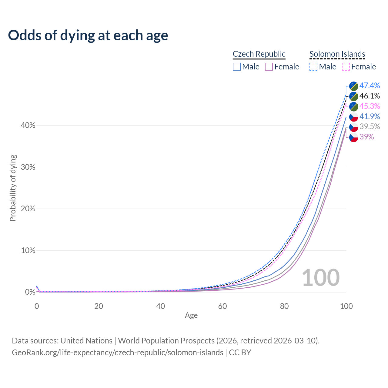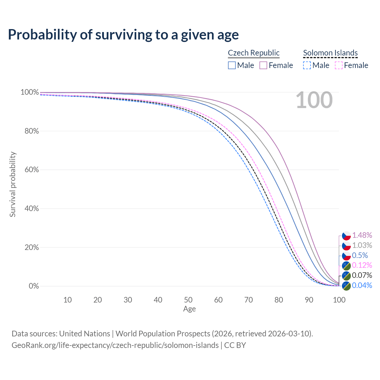 This life expectancy calculator shows the odds of living to 100, 95, 90, and below based on current age for both males and females in the Czech Republic and the Solomon Islands, along with mean and median age of death. The calculations are based on the 2026 life tables (actuarial tables) from the UN World Population Prospects.