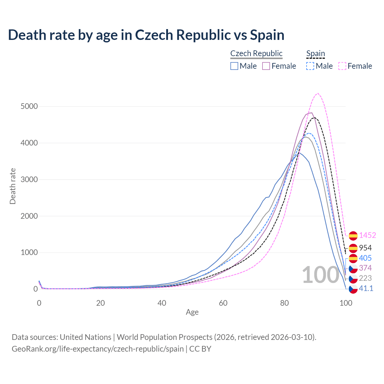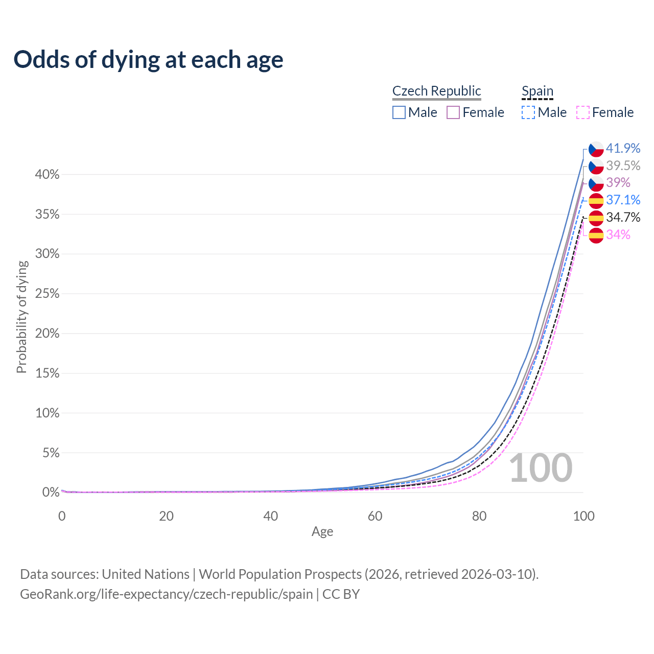 This life expectancy calculator shows the odds of living to 100, 95, 90, and below based on current age for both males and females in the Czech Republic and Spain, along with mean and median age of death. The calculations are based on the 2026 life tables (actuarial tables) from the UN World Population Prospects.