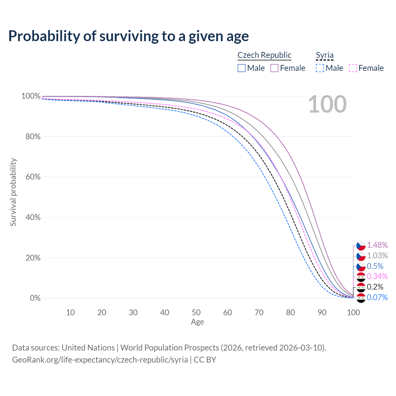 This life expectancy calculator shows the odds of living to 100, 95, 90, and below based on current age for both males and females in the Czech Republic and Syria, along with mean and median age of death. The calculations are based on the 2026 life tables (actuarial tables) from the UN World Population Prospects.