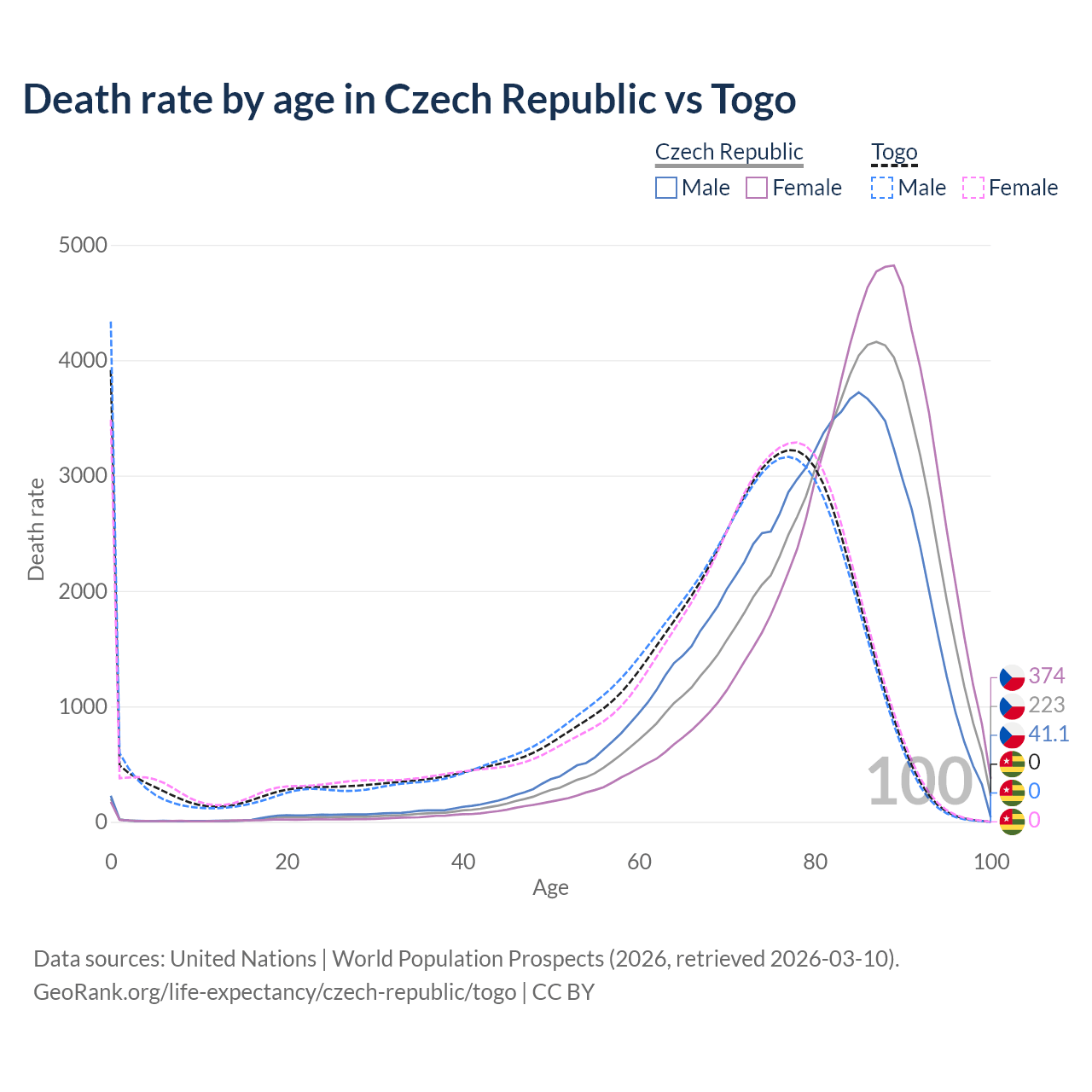 In the Czech Republic, the most common age of death is 87, compared to 0 in Togo. The median age of death is 83.2 in the Czech Republic and 71 in Togo, meaning only half of each cohort is expected to live past that age.