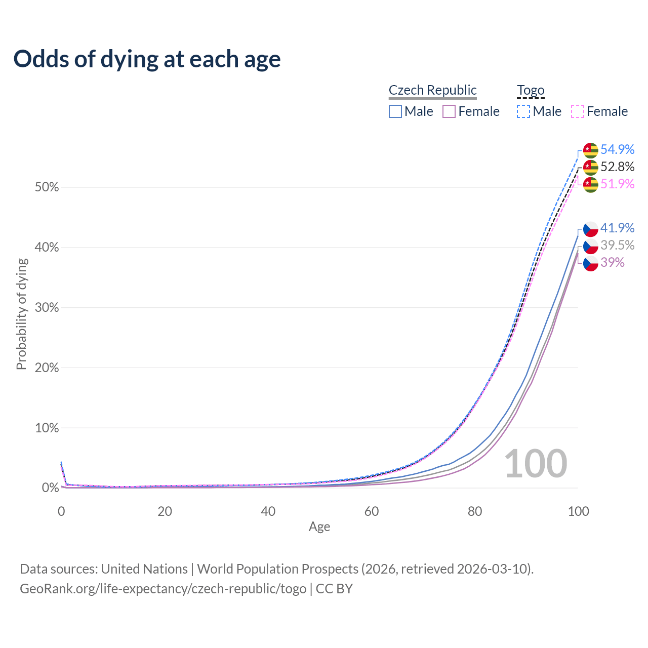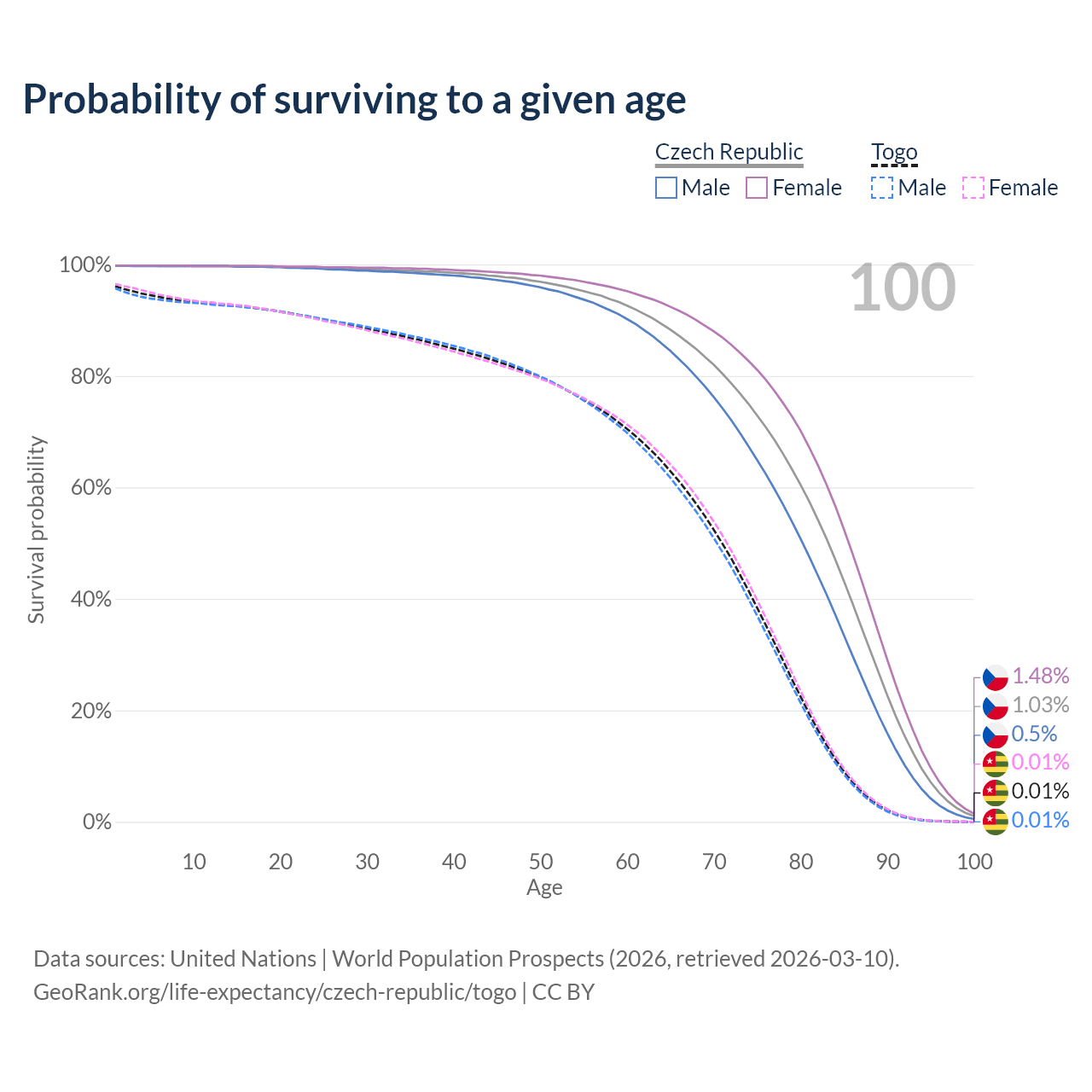 This life expectancy calculator shows the odds of living to 100, 95, 90, and below based on current age for both males and females in the Czech Republic and Togo, along with mean and median age of death. The calculations are based on the 2026 life tables (actuarial tables) from the UN World Population Prospects.