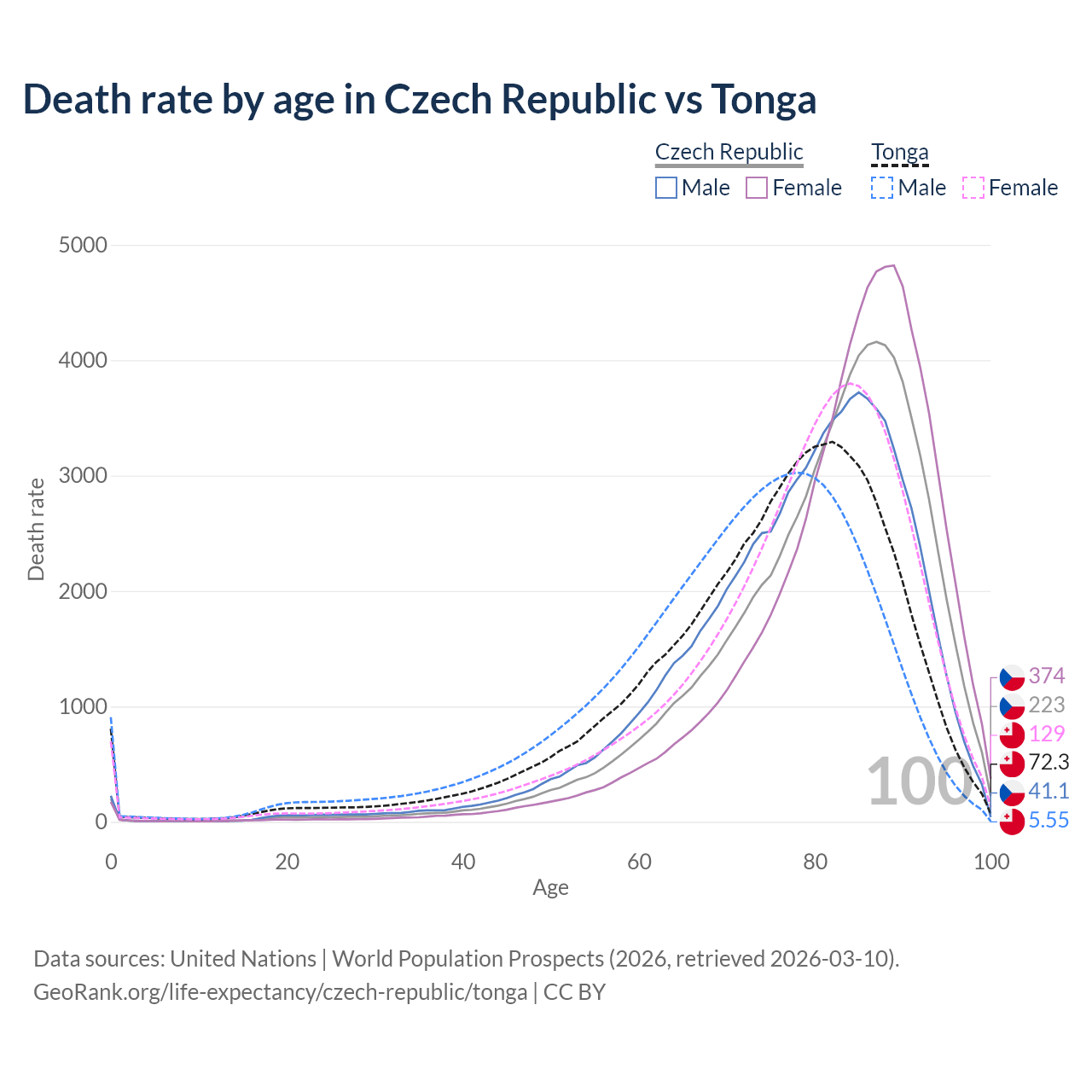 In the Czech Republic, the most common age of death is 87, compared to 82 in Tonga. The median age of death is 83.2 in the Czech Republic and 77 in Tonga, meaning only half of each cohort is expected to live past that age.