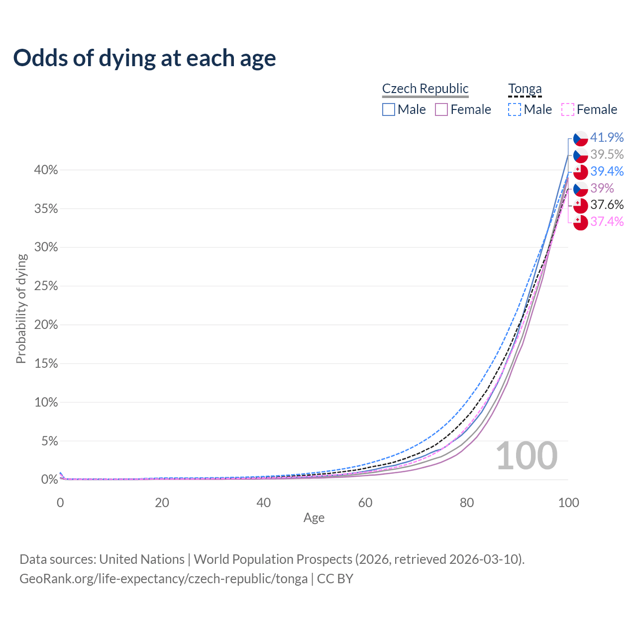 This life expectancy calculator shows the odds of living to 100, 95, 90, and below based on current age for both males and females in the Czech Republic and Tonga, along with mean and median age of death. The calculations are based on the 2026 life tables (actuarial tables) from the UN World Population Prospects.