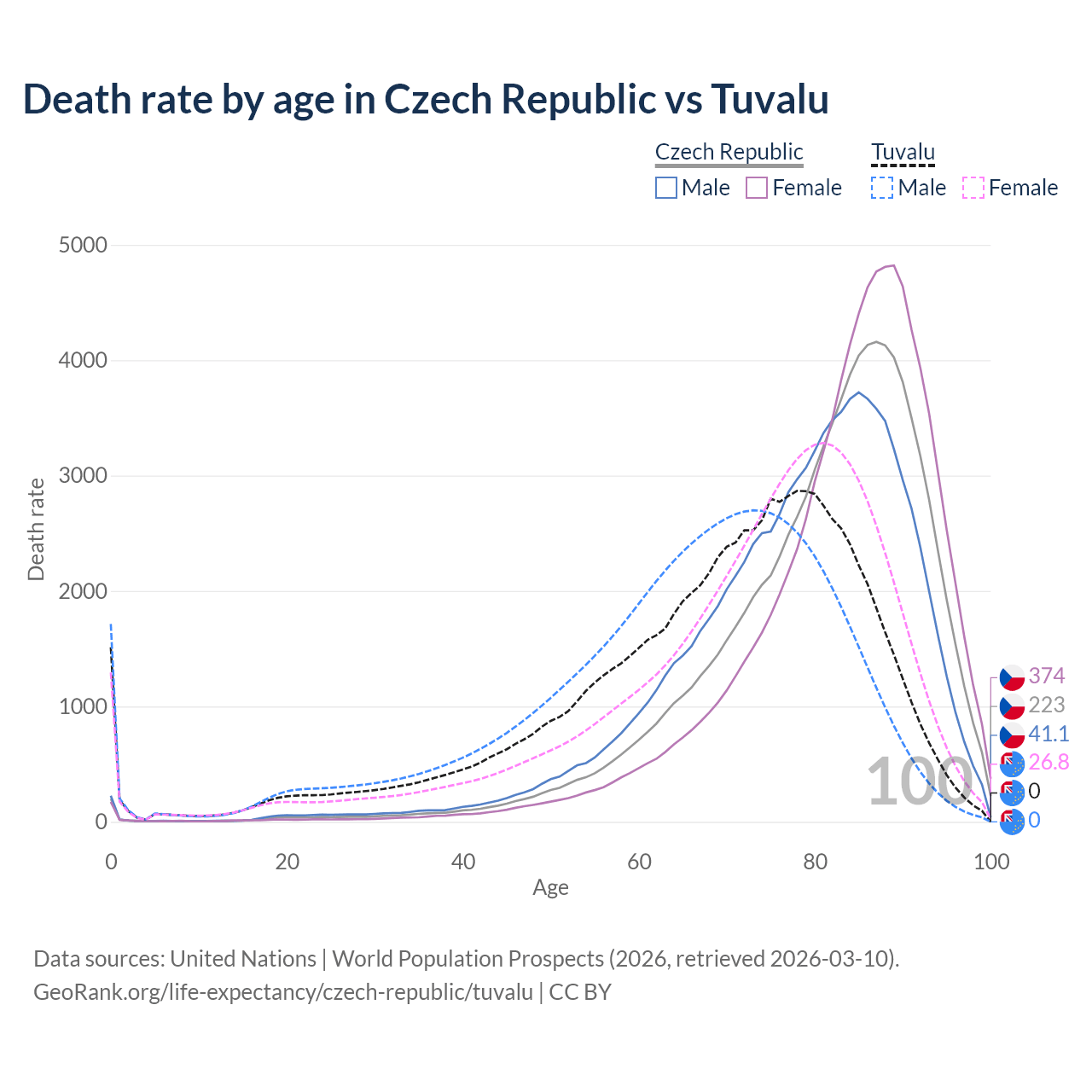 In the Czech Republic, the most common age of death is 87, compared to 78 in Tuvalu. The median age of death is 83.2 in the Czech Republic and 71.9 in Tuvalu, meaning only half of each cohort is expected to live past that age.