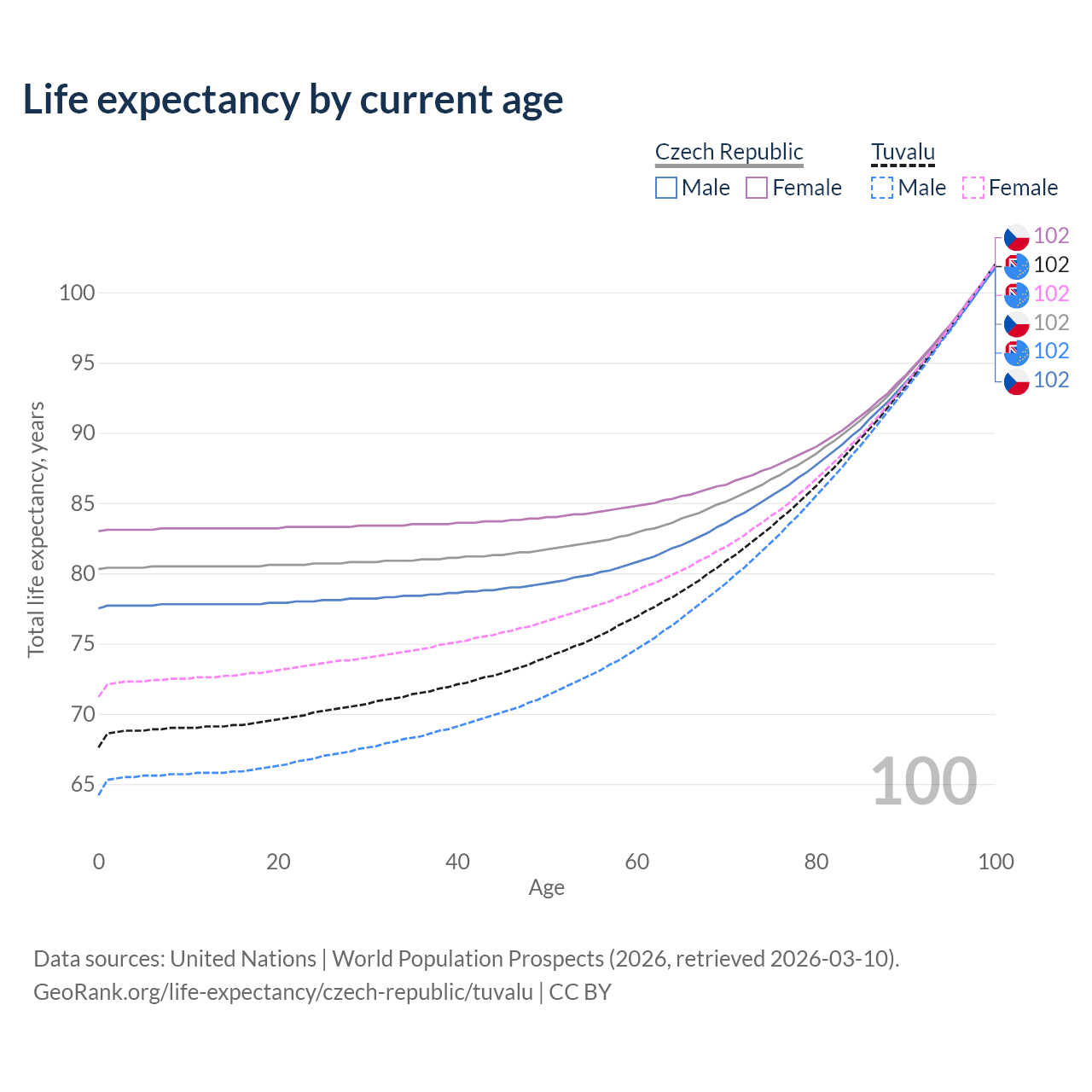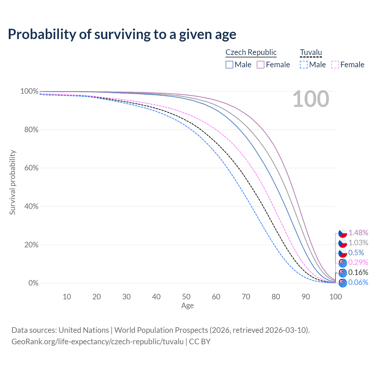 This life expectancy calculator shows the odds of living to 100, 95, 90, and below based on current age for both males and females in the Czech Republic and Tuvalu, along with mean and median age of death. The calculations are based on the 2026 life tables (actuarial tables) from the UN World Population Prospects.