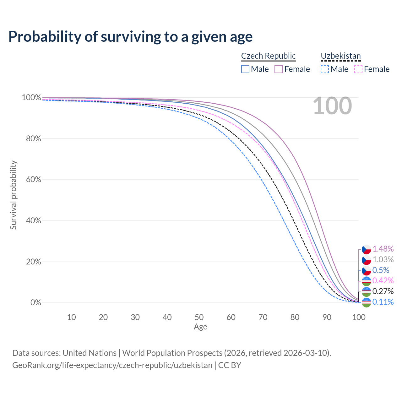 This life expectancy calculator shows the odds of living to 100, 95, 90, and below based on current age for both males and females in the Czech Republic and Uzbekistan, along with mean and median age of death. The calculations are based on the 2026 life tables (actuarial tables) from the UN World Population Prospects.