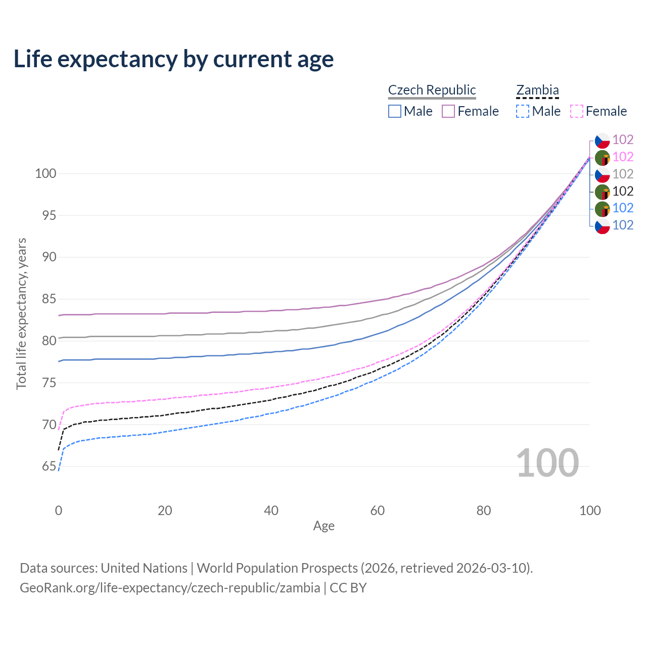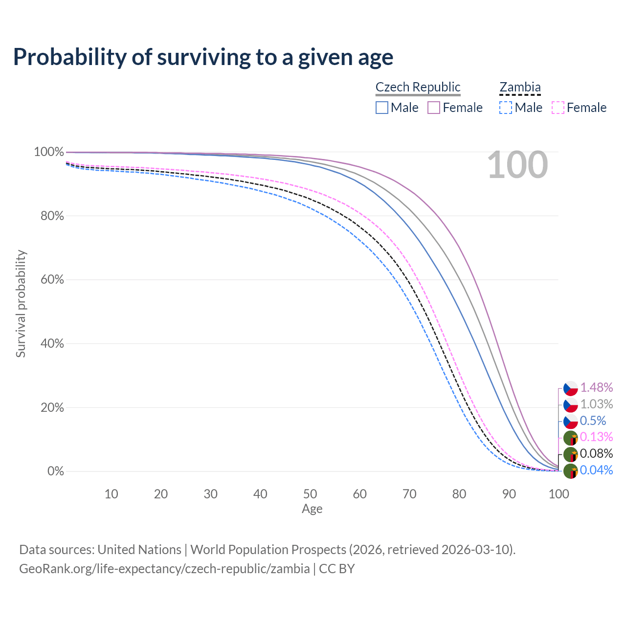 This life expectancy calculator shows the odds of living to 100, 95, 90, and below based on current age for both males and females in the Czech Republic and Zambia, along with mean and median age of death. The calculations are based on the 2026 life tables (actuarial tables) from the UN World Population Prospects.