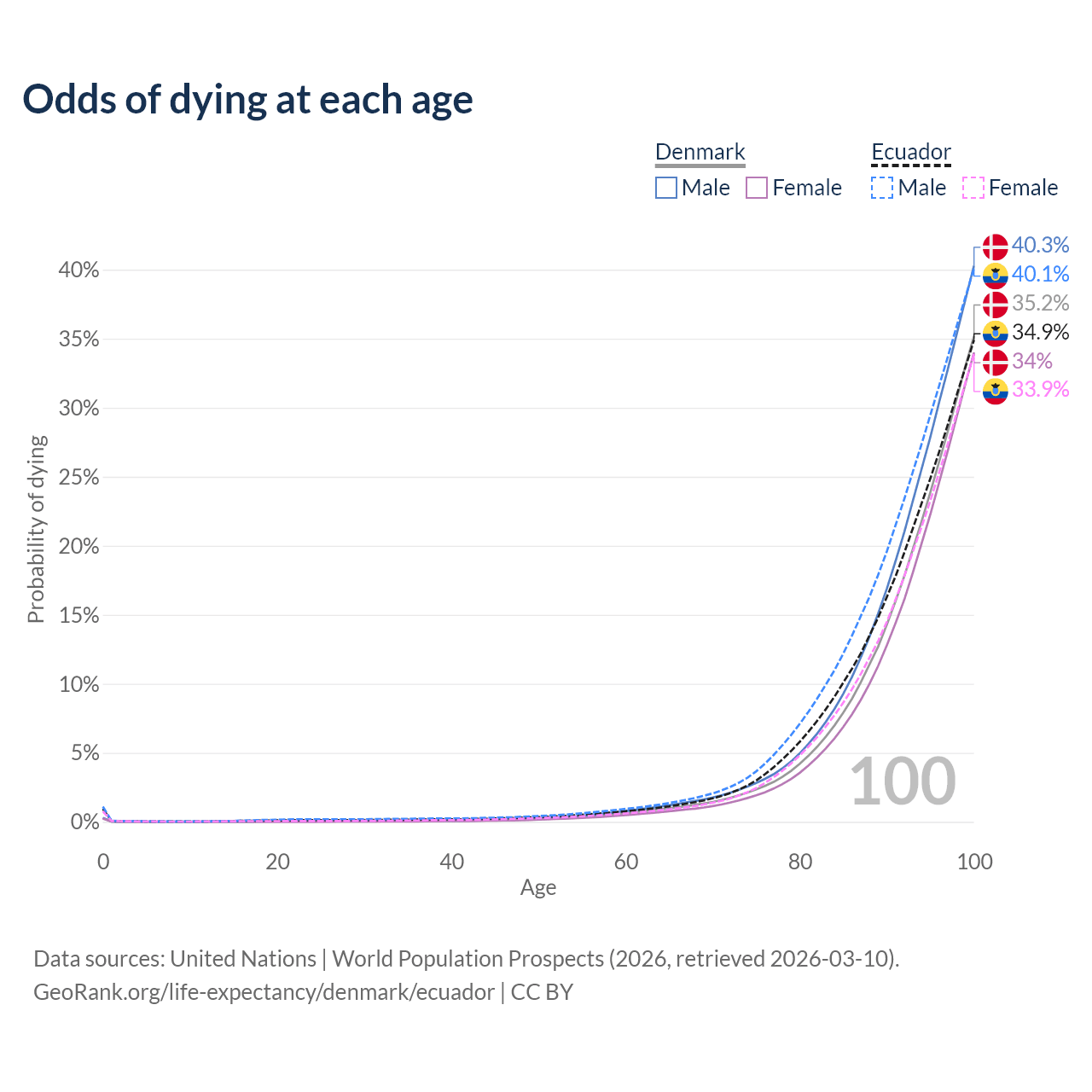 This life expectancy calculator shows the odds of living to 100, 95, 90, and below based on current age for both males and females in Denmark and Ecuador, along with mean and median age of death. The calculations are based on the 2026 life tables (actuarial tables) from the UN World Population Prospects.