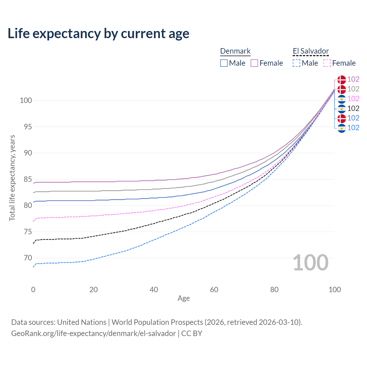 This life expectancy calculator shows the odds of living to 100, 95, 90, and below based on current age for both males and females in Denmark and El Salvador, along with mean and median age of death. The calculations are based on the 2026 life tables (actuarial tables) from the UN World Population Prospects.