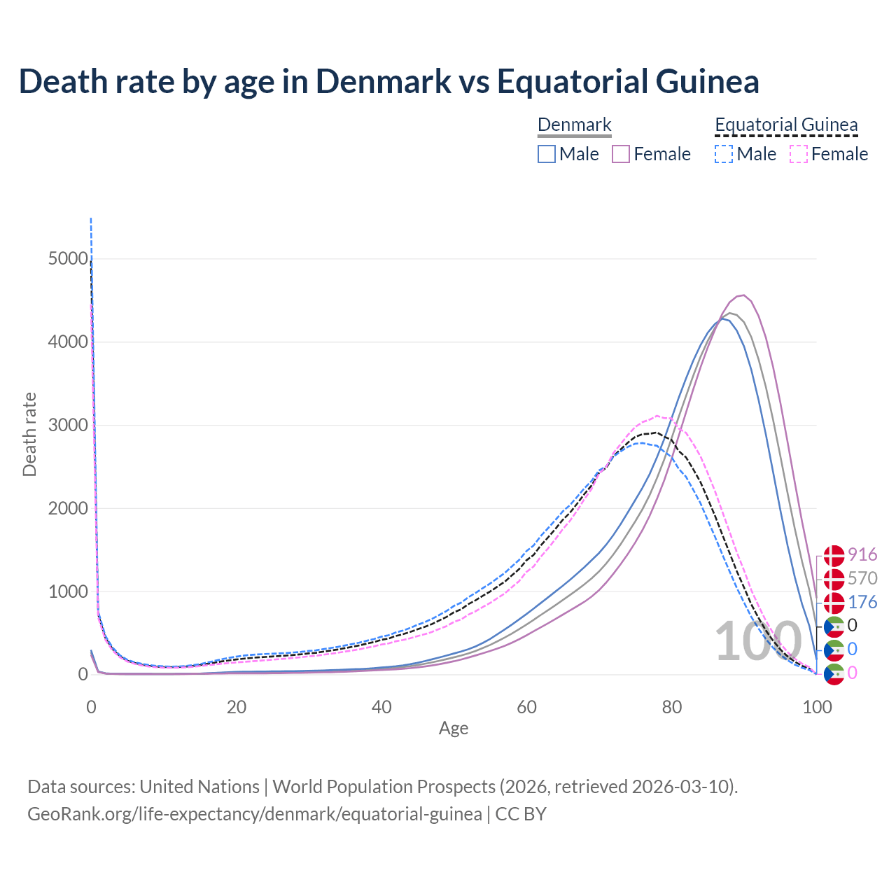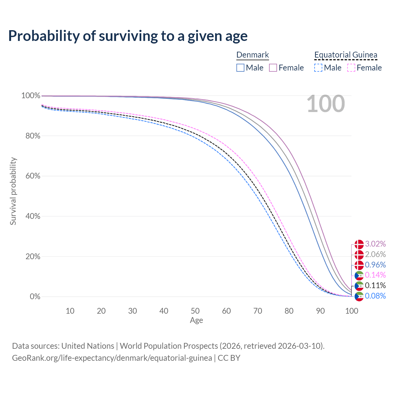 This life expectancy calculator shows the odds of living to 100, 95, 90, and below based on current age for both males and females in Denmark and Equatorial Guinea, along with mean and median age of death. The calculations are based on the 2026 life tables (actuarial tables) from the UN World Population Prospects.