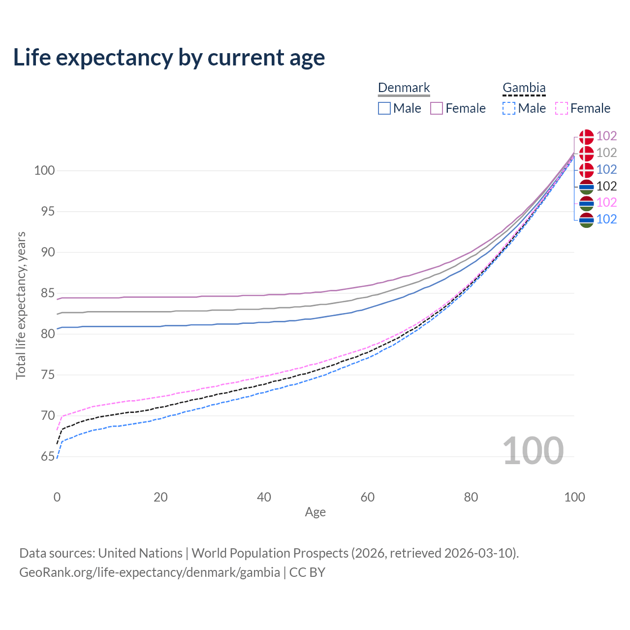 This life expectancy calculator shows the odds of living to 100, 95, 90, and below based on current age for both males and females in Denmark and the Gambia, along with mean and median age of death. The calculations are based on the 2026 life tables (actuarial tables) from the UN World Population Prospects.