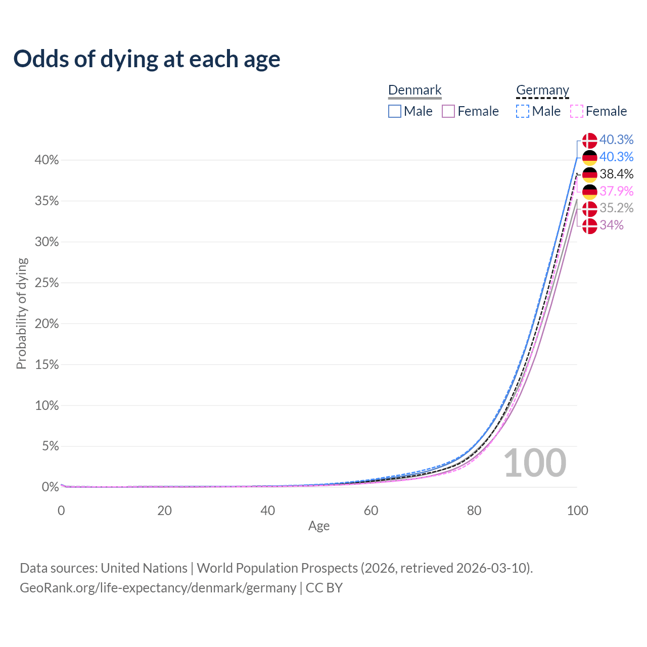 This life expectancy calculator shows the odds of living to 100, 95, 90, and below based on current age for both males and females in Denmark and Germany, along with mean and median age of death. The calculations are based on the 2026 life tables (actuarial tables) from the UN World Population Prospects.