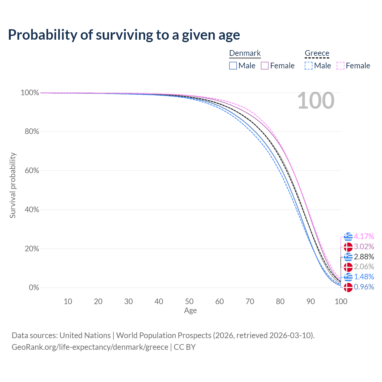 This life expectancy calculator shows the odds of living to 100, 95, 90, and below based on current age for both males and females in Denmark and Greece, along with mean and median age of death. The calculations are based on the 2026 life tables (actuarial tables) from the UN World Population Prospects.