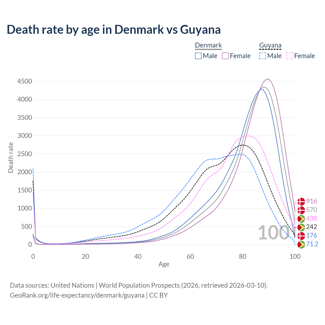 In Denmark, the most common age of death is 88, compared to 80 in Guyana. The median age of death is 85.2 in Denmark and 74.1 in Guyana, meaning only half of each cohort is expected to live past that age.
