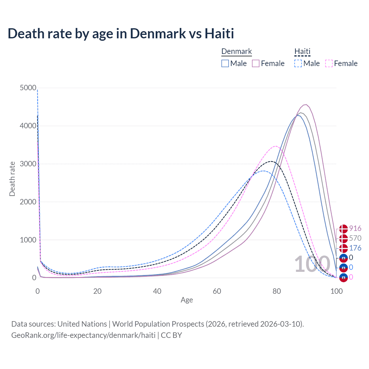 In Denmark, the most common age of death is 88, compared to 0 in Haiti. The median age of death is 85.2 in Denmark and 72 in Haiti, meaning only half of each cohort is expected to live past that age.