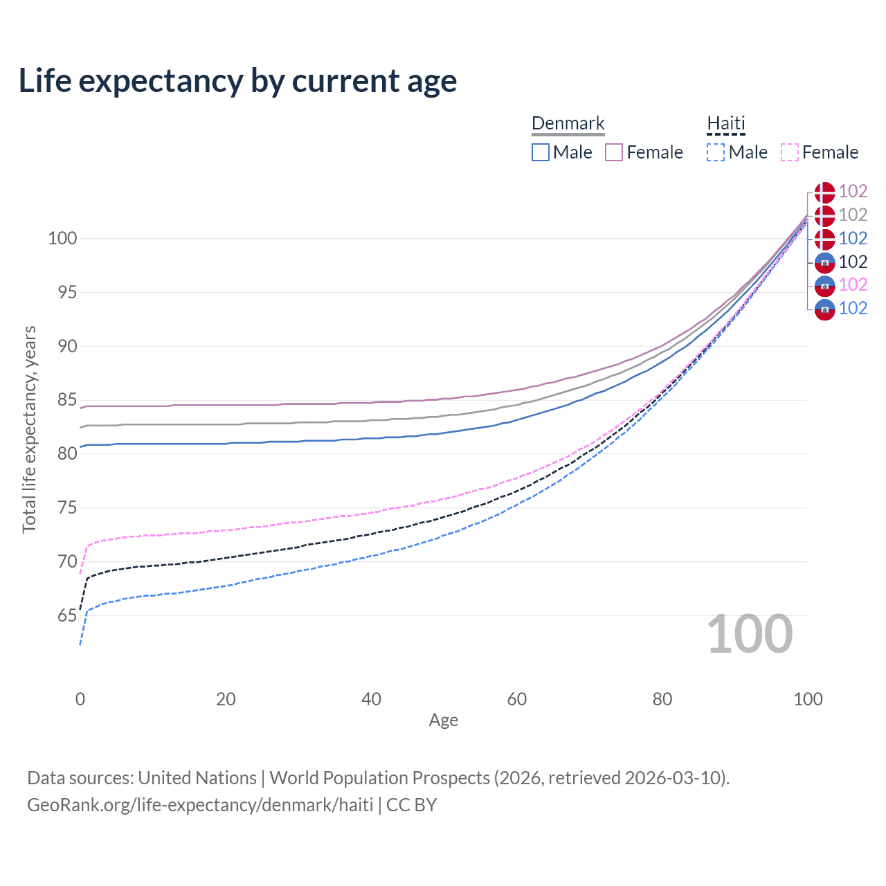 This life expectancy calculator shows the odds of living to 100, 95, 90, and below based on current age for both males and females in Denmark and Haiti, along with mean and median age of death. The calculations are based on the 2026 life tables (actuarial tables) from the UN World Population Prospects.