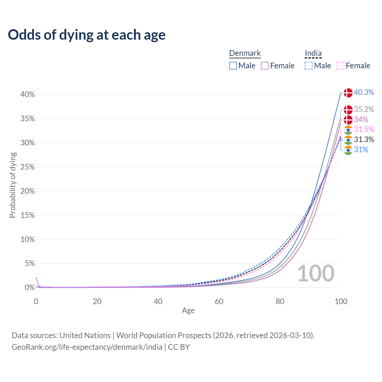 This life expectancy calculator shows the odds of living to 100, 95, 90, and below based on current age for both males and females in Denmark and India, along with mean and median age of death. The calculations are based on the 2026 life tables (actuarial tables) from the UN World Population Prospects.