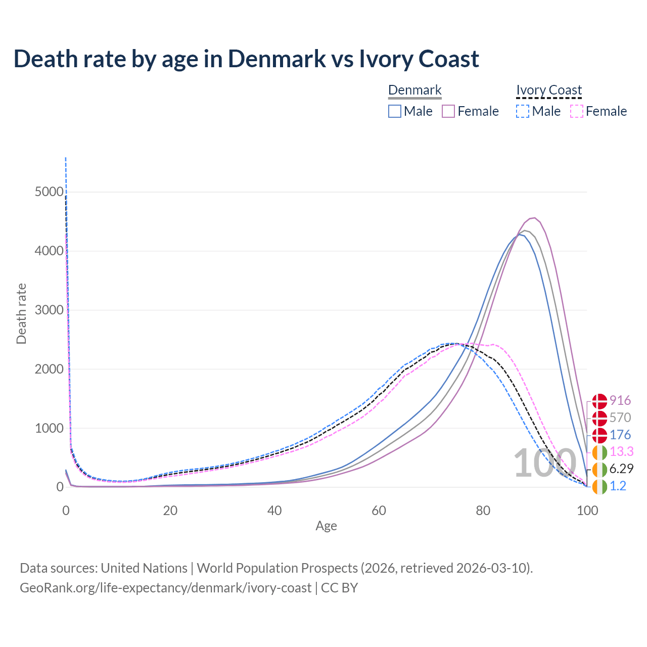In Denmark, the most common age of death is 88, compared to 0 in Ivory Coast. The median age of death is 85.2 in Denmark and 68.6 in Ivory Coast, meaning only half of each cohort is expected to live past that age.