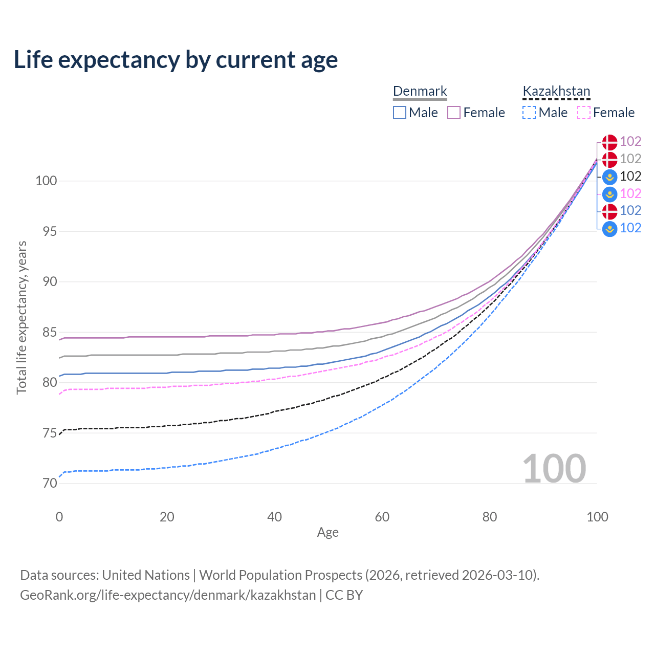 This life expectancy calculator shows the odds of living to 100, 95, 90, and below based on current age for both males and females in Denmark and Kazakhstan, along with mean and median age of death. The calculations are based on the 2026 life tables (actuarial tables) from the UN World Population Prospects.