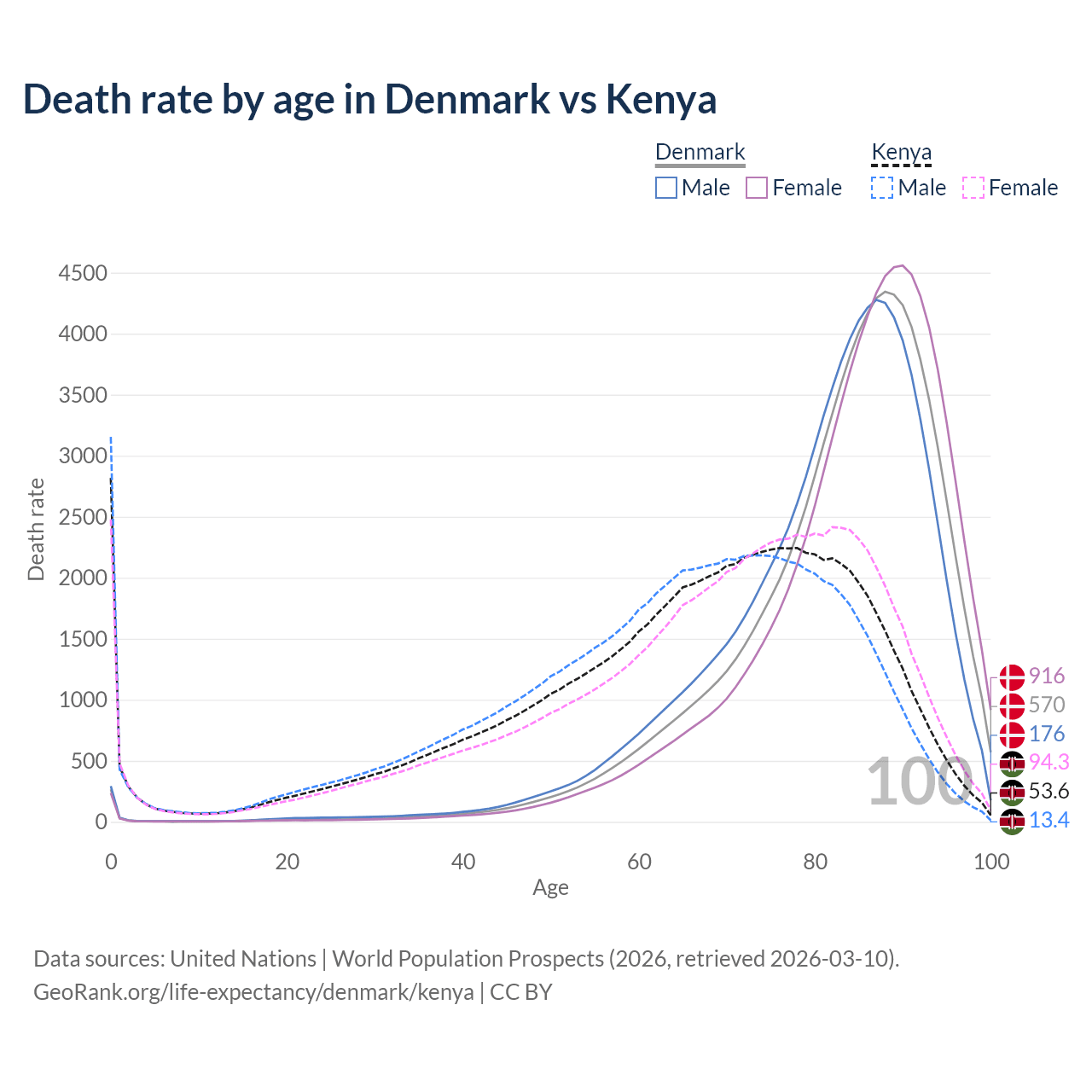 In Denmark, the most common age of death is 88, compared to 0 in Kenya. The median age of death is 85.2 in Denmark and 68.8 in Kenya, meaning only half of each cohort is expected to live past that age.