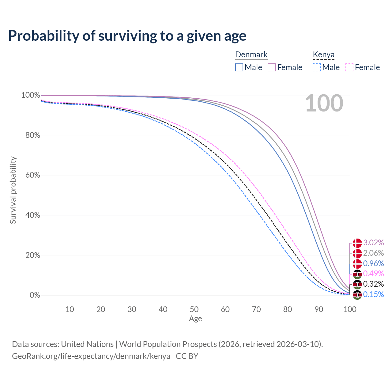 This life expectancy calculator shows the odds of living to 100, 95, 90, and below based on current age for both males and females in Denmark and Kenya, along with mean and median age of death. The calculations are based on the 2026 life tables (actuarial tables) from the UN World Population Prospects.