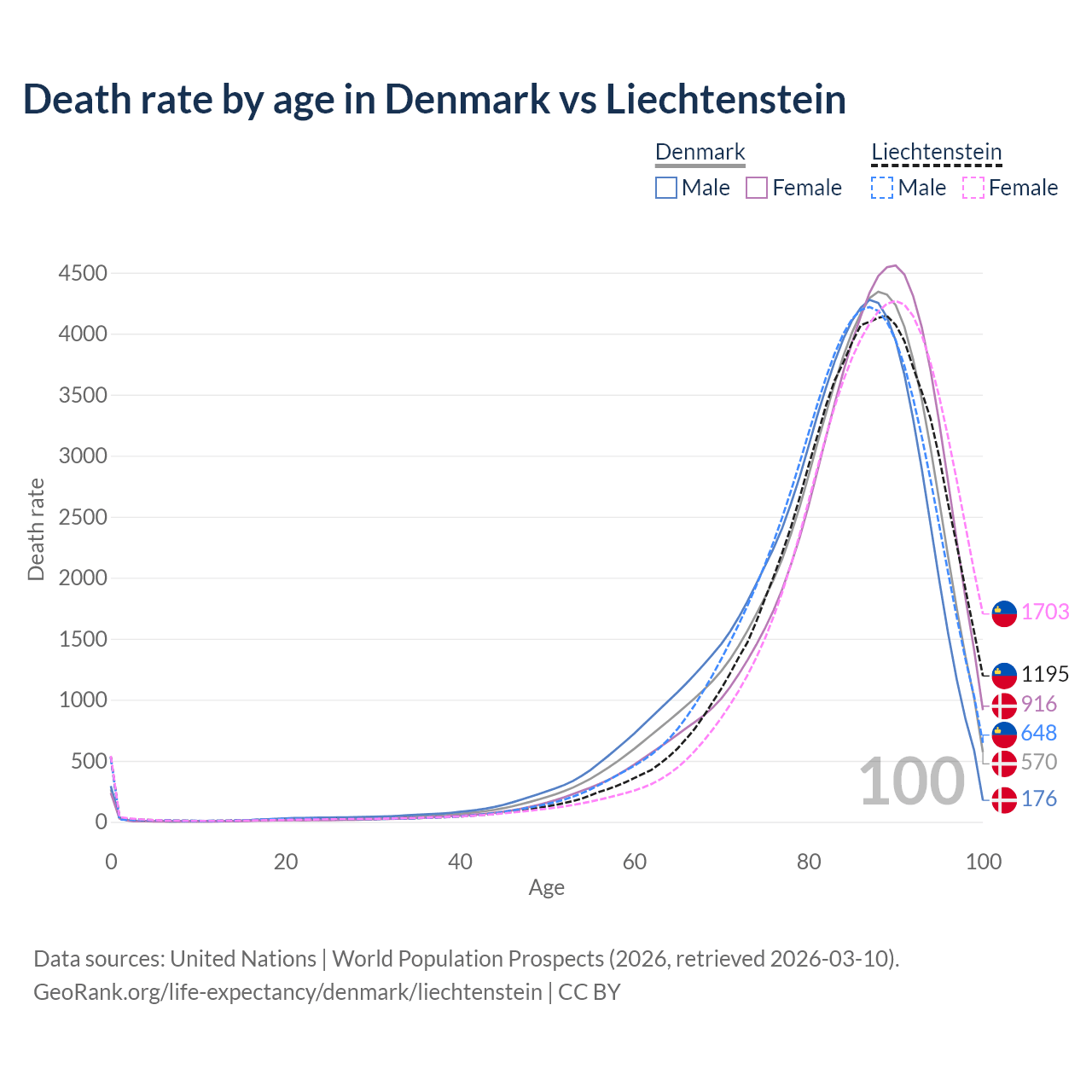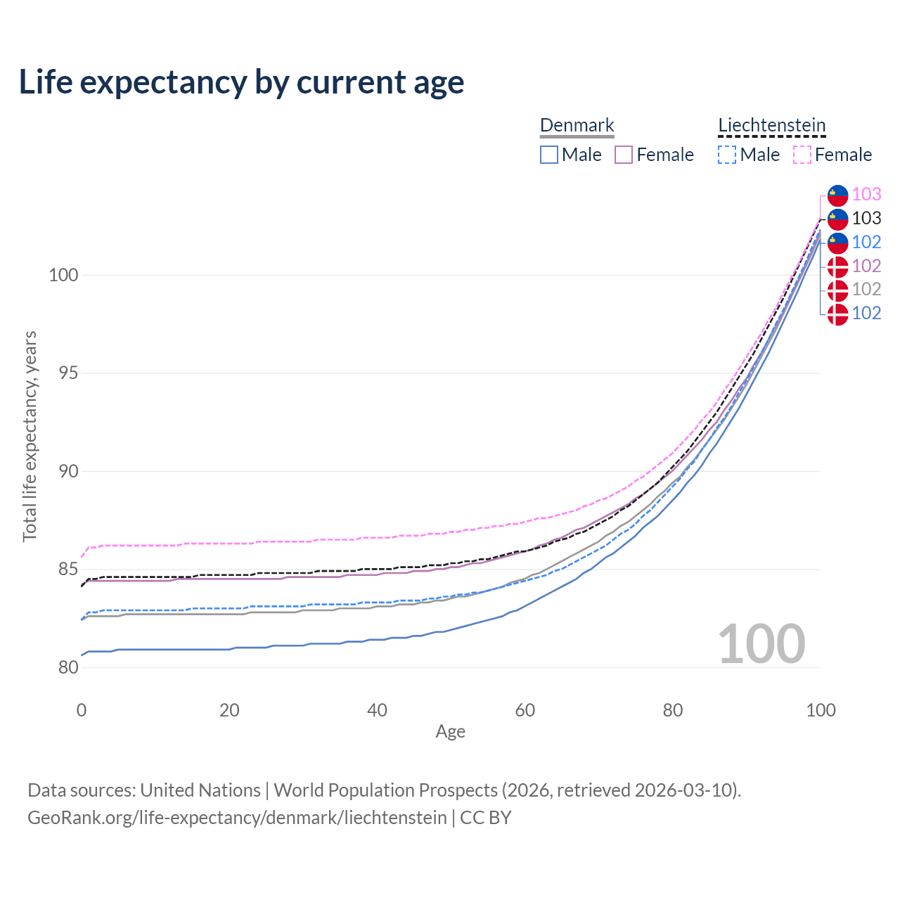 This life expectancy calculator shows the odds of living to 100, 95, 90, and below based on current age for both males and females in Denmark and Liechtenstein, along with mean and median age of death. The calculations are based on the 2026 life tables (actuarial tables) from the UN World Population Prospects.