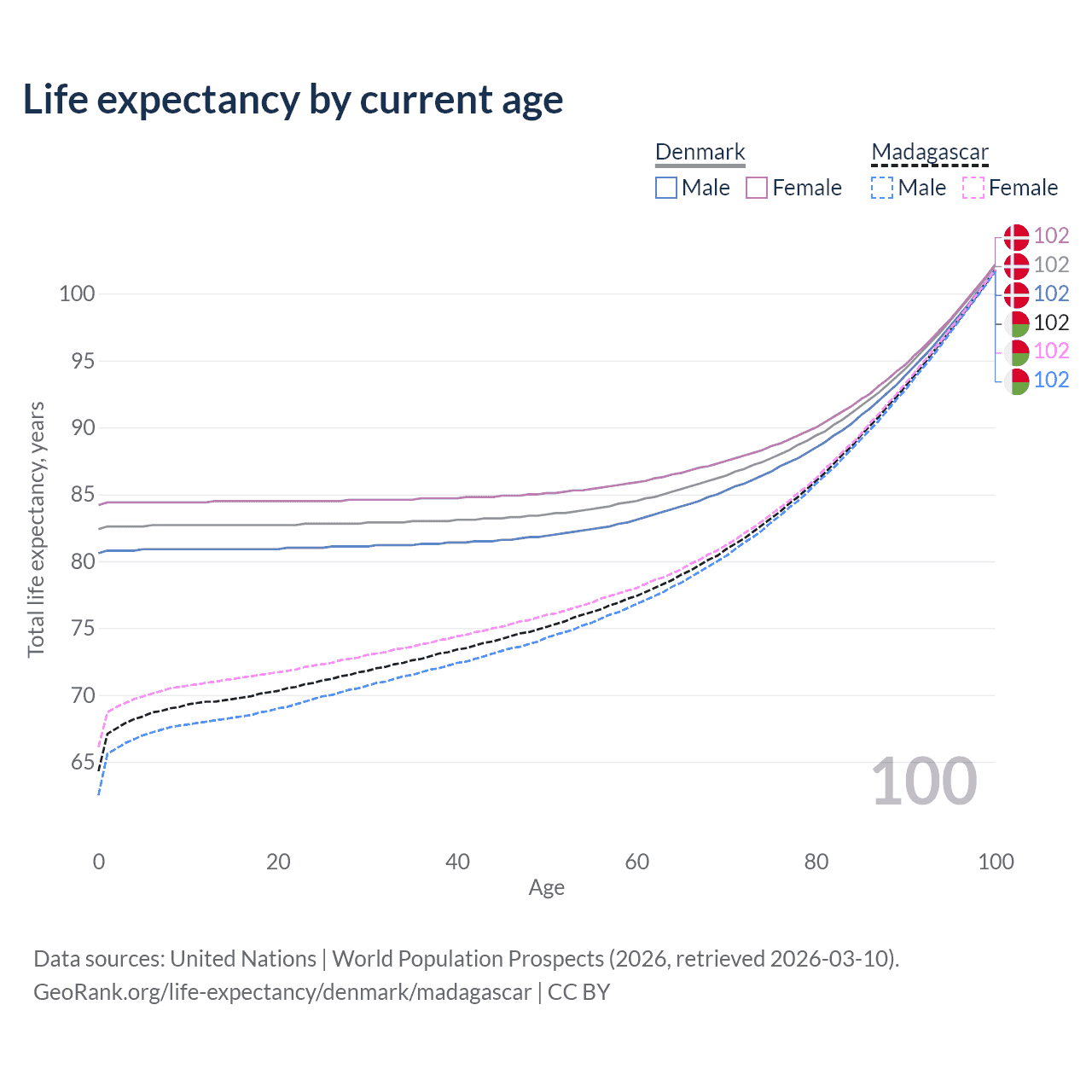 This life expectancy calculator shows the odds of living to 100, 95, 90, and below based on current age for both males and females in Denmark and Madagascar, along with mean and median age of death. The calculations are based on the 2026 life tables (actuarial tables) from the UN World Population Prospects.