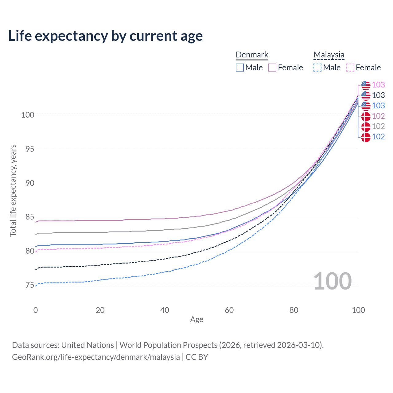 This life expectancy calculator shows the odds of living to 100, 95, 90, and below based on current age for both males and females in Denmark and Malaysia, along with mean and median age of death. The calculations are based on the 2026 life tables (actuarial tables) from the UN World Population Prospects.