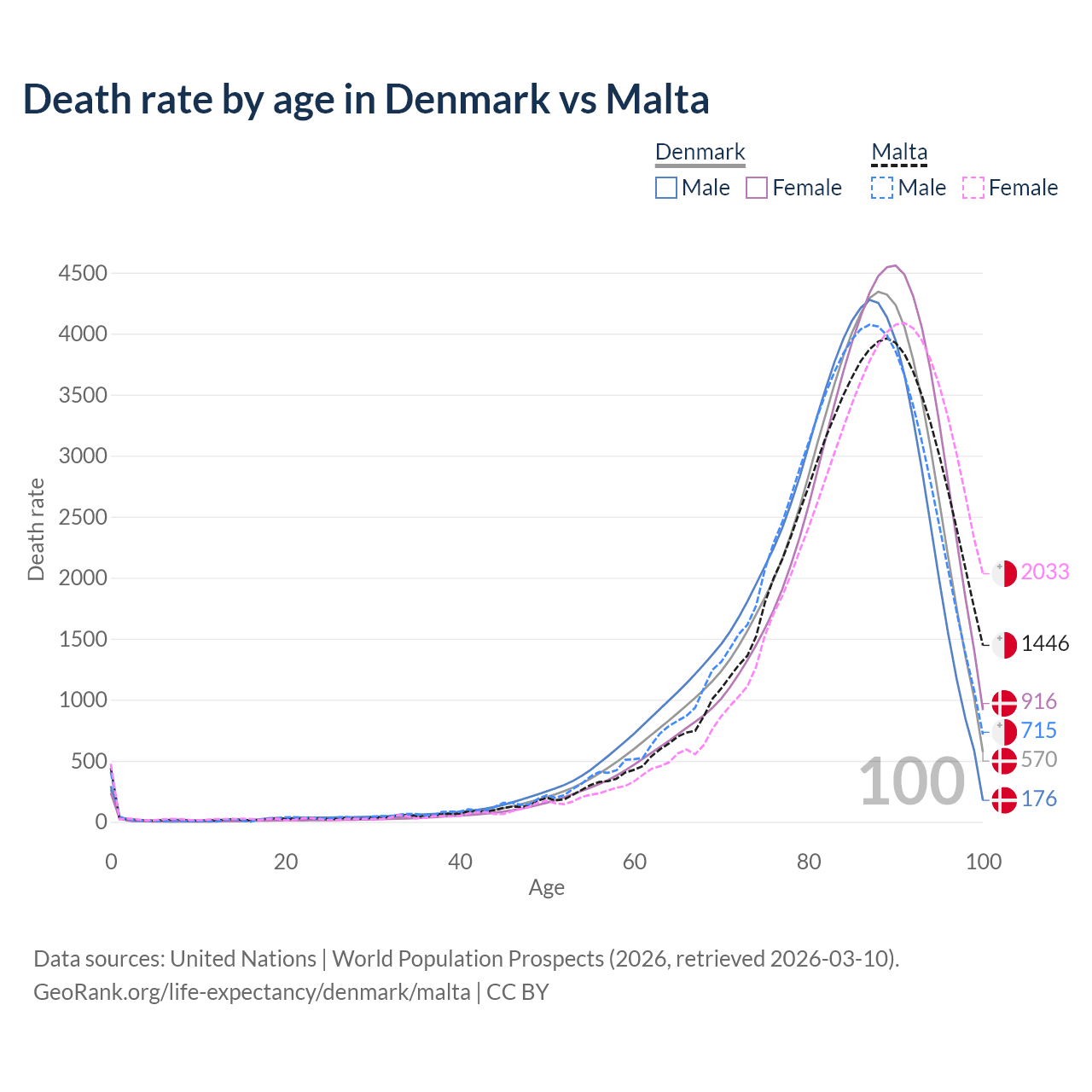 This life expectancy calculator shows the odds of living to 100, 95, 90, and below based on current age for both males and females in Denmark and Malta, along with mean and median age of death. The calculations are based on the 2026 life tables (actuarial tables) from the UN World Population Prospects.