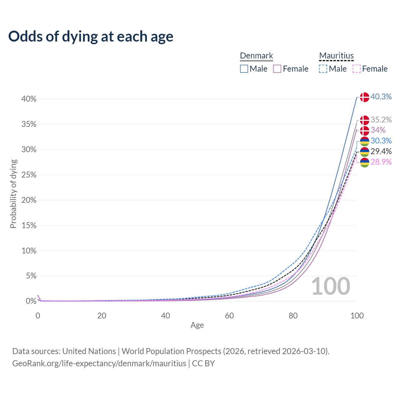 This life expectancy calculator shows the odds of living to 100, 95, 90, and below based on current age for both males and females in Denmark and Mauritius, along with mean and median age of death. The calculations are based on the 2026 life tables (actuarial tables) from the UN World Population Prospects.