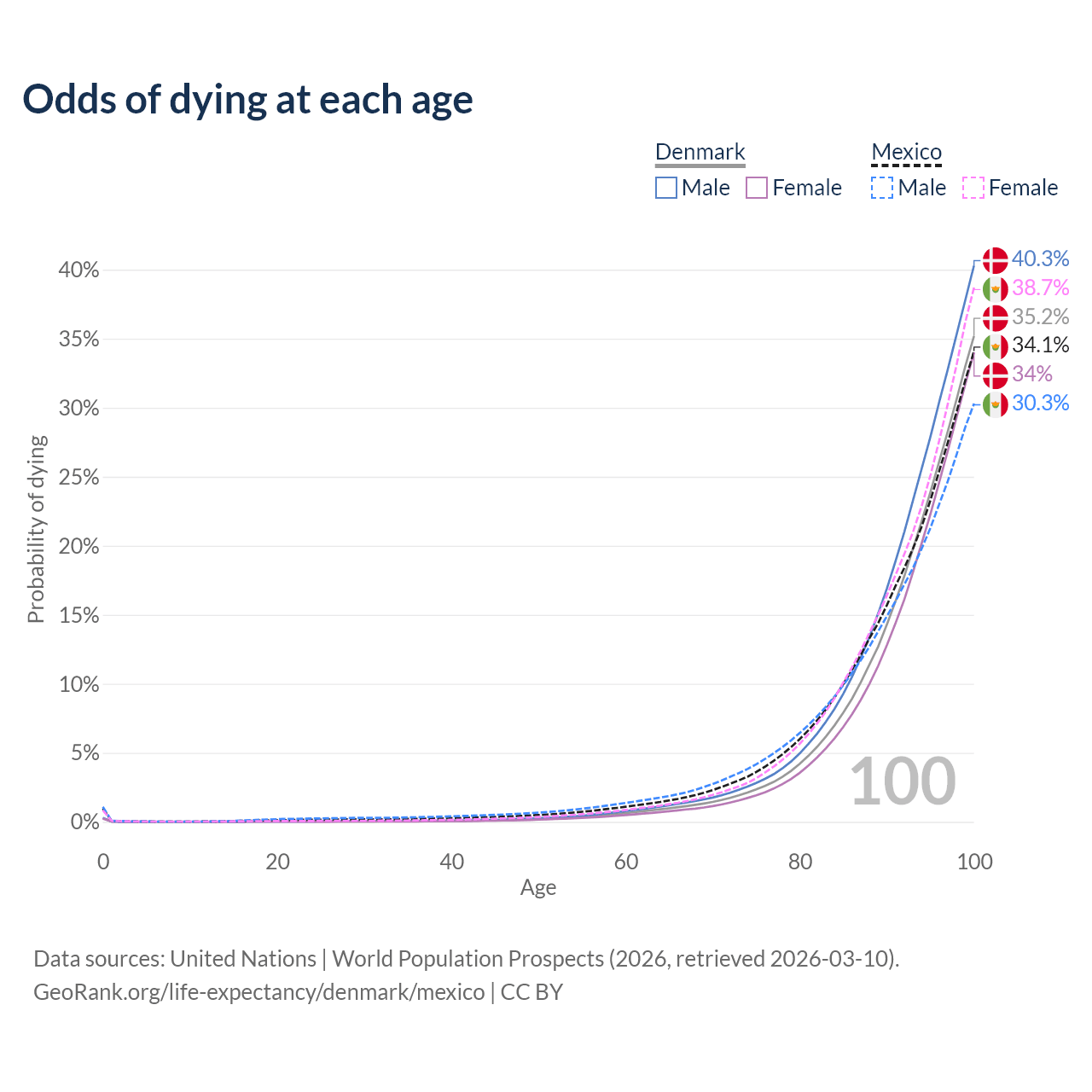 This life expectancy calculator shows the odds of living to 100, 95, 90, and below based on current age for both males and females in Denmark and Mexico, along with mean and median age of death. The calculations are based on the 2026 life tables (actuarial tables) from the UN World Population Prospects.