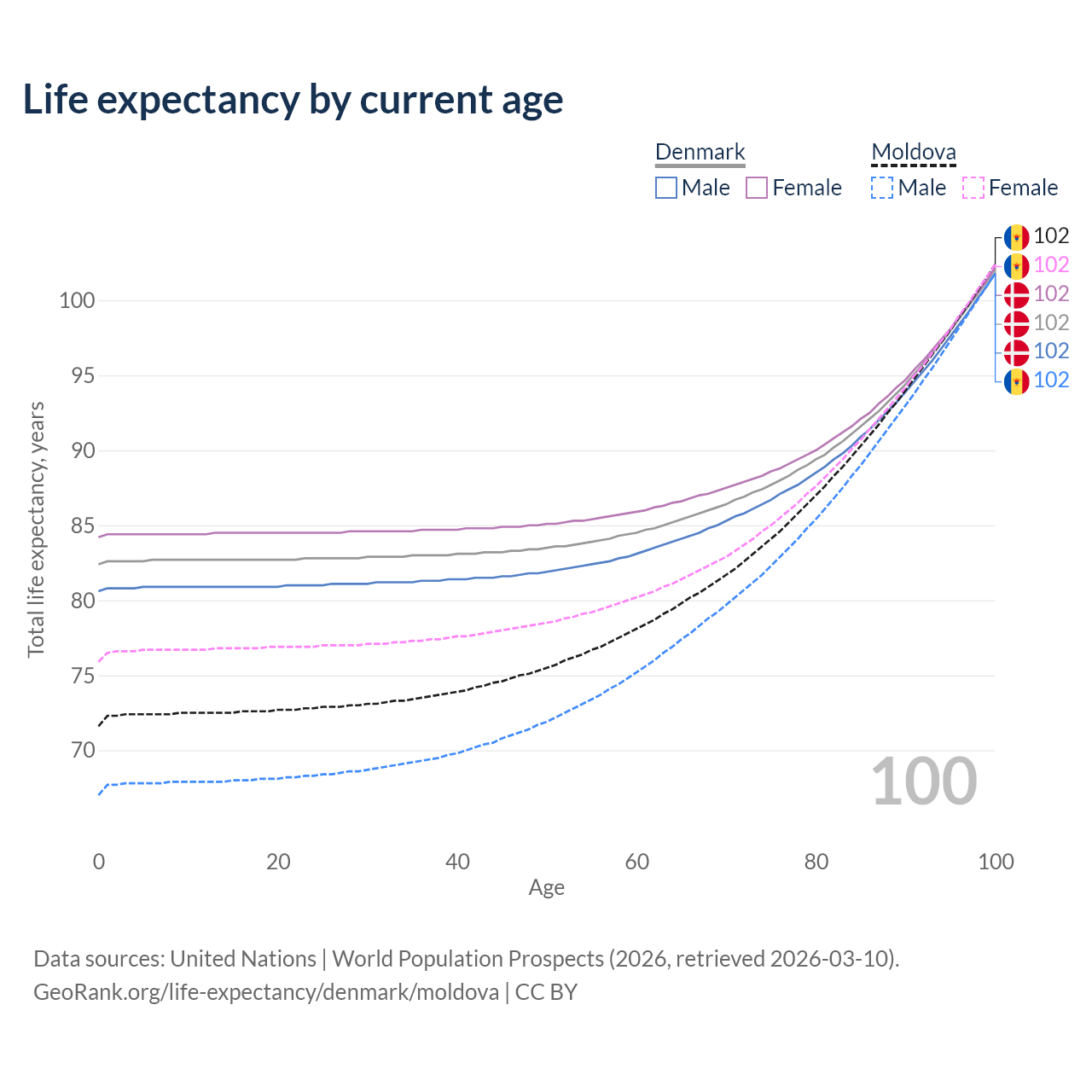 This life expectancy calculator shows the odds of living to 100, 95, 90, and below based on current age for both males and females in Denmark and Moldova, along with mean and median age of death. The calculations are based on the 2026 life tables (actuarial tables) from the UN World Population Prospects.