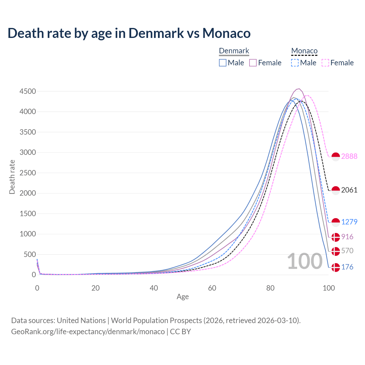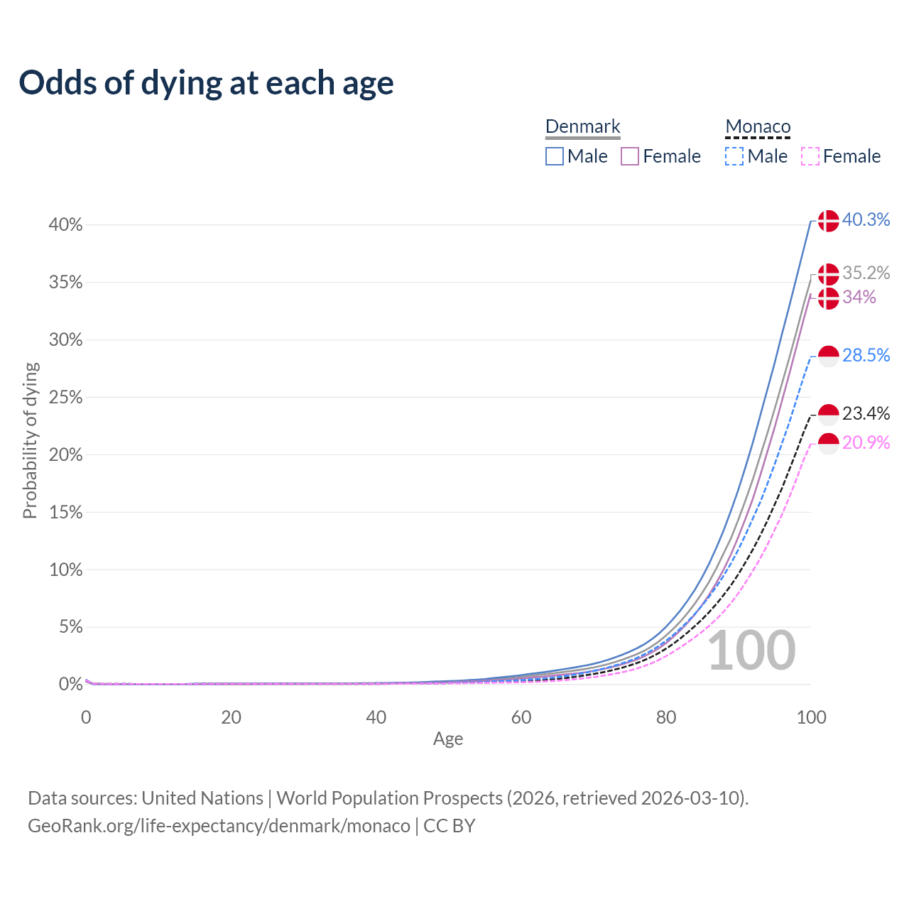 This life expectancy calculator shows the odds of living to 100, 95, 90, and below based on current age for both males and females in Denmark and Monaco, along with mean and median age of death. The calculations are based on the 2026 life tables (actuarial tables) from the UN World Population Prospects.