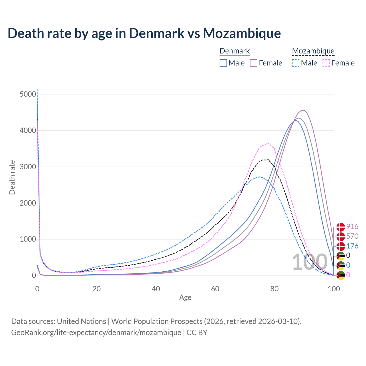 Note that this chart does not show rates per 100,000 population, as those would be skewed by age structure differences and reflect the demographics of Denmark and Mozambique more than their death rates.