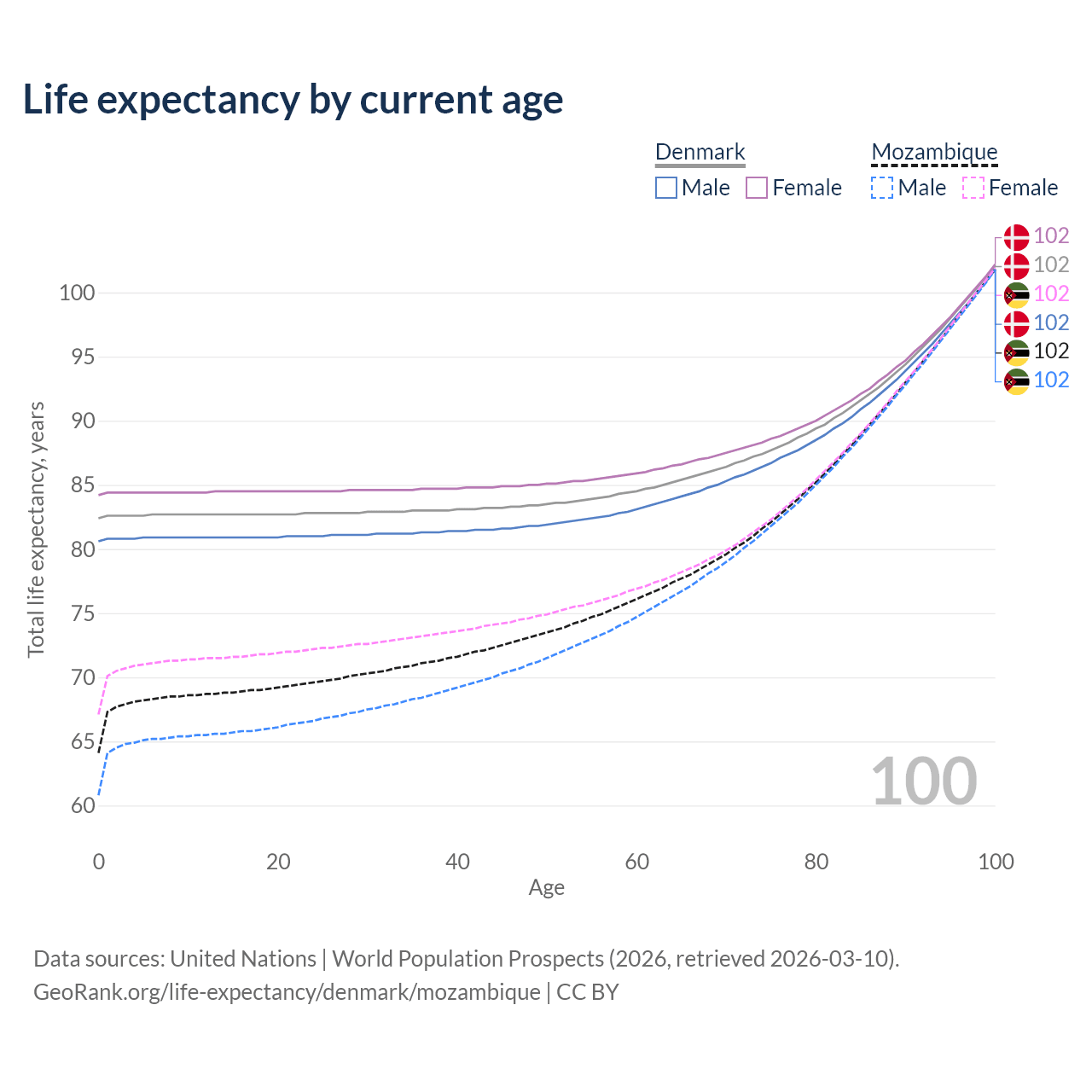 This life expectancy calculator shows the odds of living to 100, 95, 90, and below based on current age for both males and females in Denmark and Mozambique, along with mean and median age of death. The calculations are based on the 2026 life tables (actuarial tables) from the UN World Population Prospects.